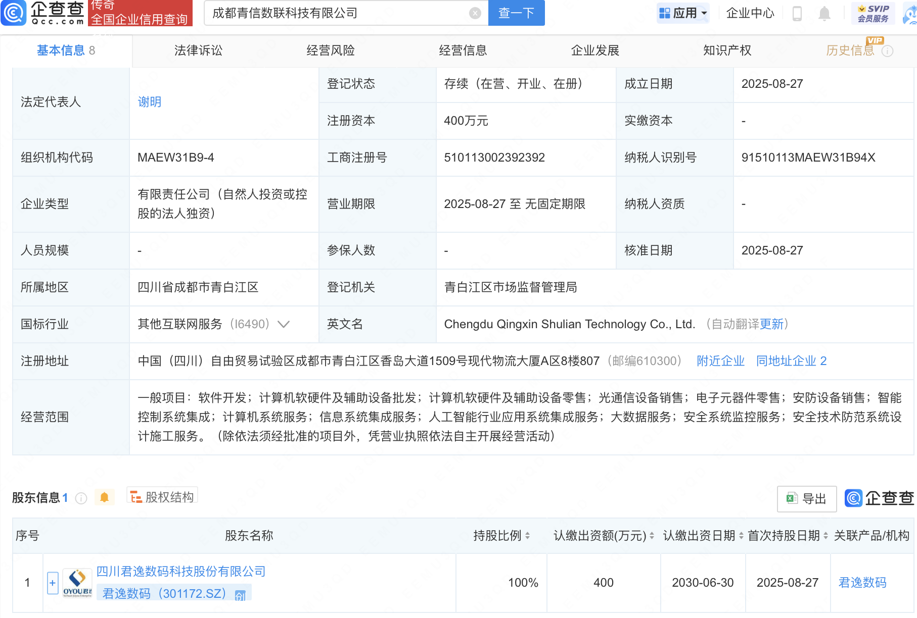 企查查APP显示,近日,成都青信数联科技有限公司成立,法定代表人为谢明,经营范围包含:人工智能行业应用系统集成服务;大数据服务;安全系统监控服务等。企查查股权穿透显示,该公司由君逸数码(301172)全资持股。