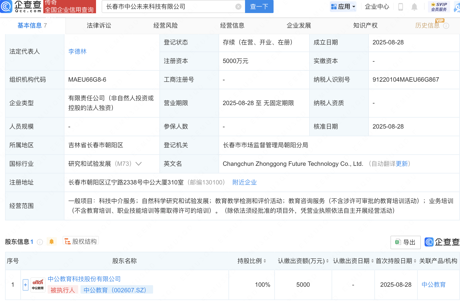 企查查APP显示,近日,长春市中公未来科技有限公司成立,注册资本5000万元,经营范围包含:科技中介服务;自然科学研究和试验发展;教育教学检测和评价活动等。企查查股权穿透显示,该公司由中公教育(002607)全资持股。