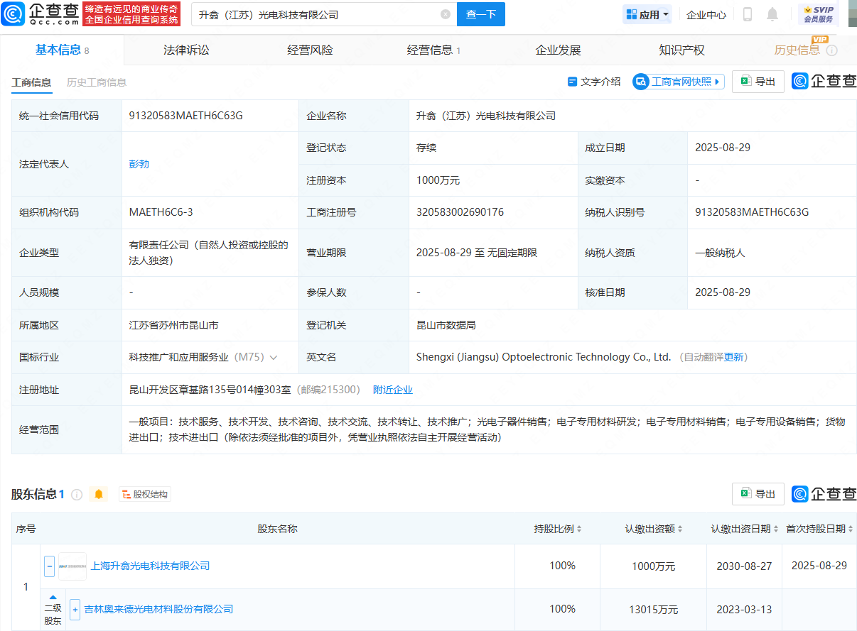 企查查APP显示,近日,升翕(江苏)光电科技有限公司成立,法定代表人为彭勃,注册资本为1000万元,经营范围包含:光电子器件销售;电子专用材料研发;电子专用材料销售;电子专用设备销售等。企查查股权穿透显示,该公司由奥来德(688378)间接全资持股。