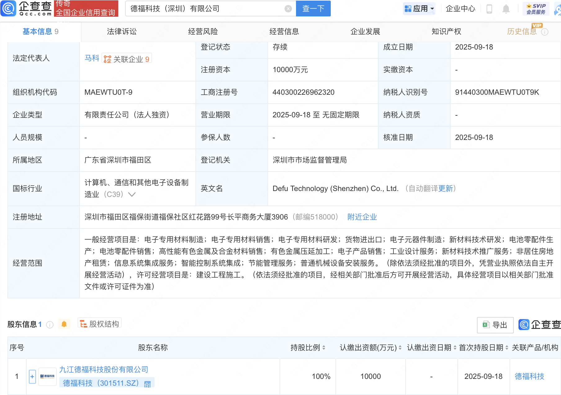 企查查APP显示,近日,德福科技(深圳)有限公司成立,注册资本1亿元,经营范围包含:电子元器件制造;新材料技术研发;电池零配件生产;电池零配件销售;高性能有色金属及合金材料销售等。企查查股权穿透显示,该公司由德福科技(301511)全资持股。