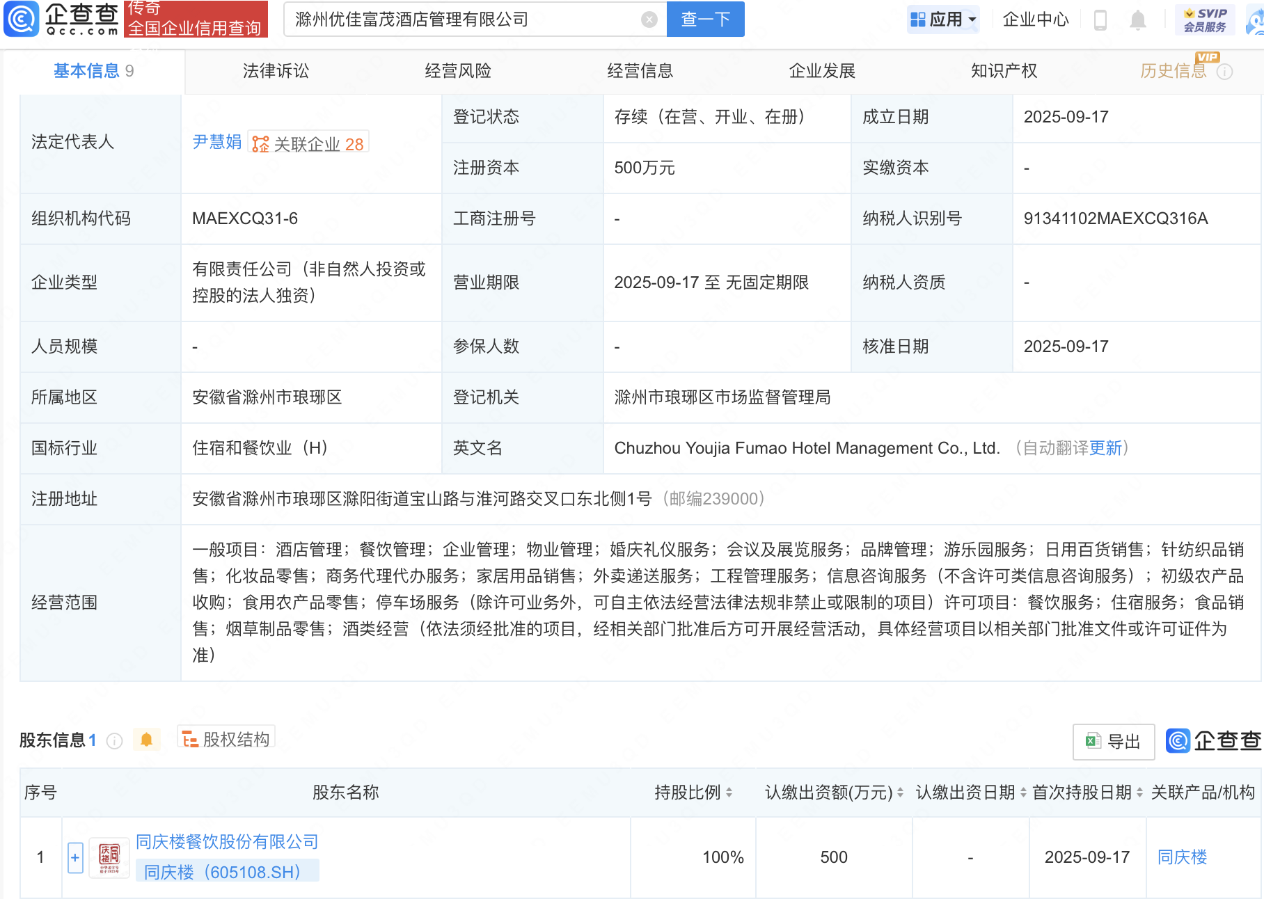 企查查APP显示,近日,滁州优佳富茂酒店管理有限公司成立,经营范围包含:餐饮服务;住宿服务;食品销售;烟草制品零售;酒类经营等。企查查股权穿透显示,该公司由同庆楼(605108)全资持股。