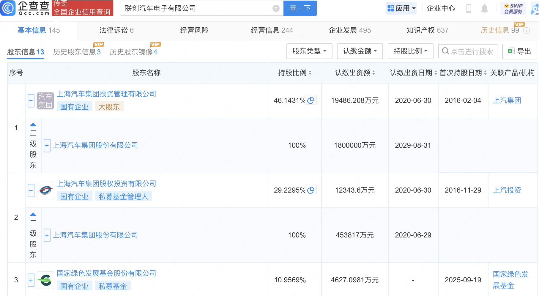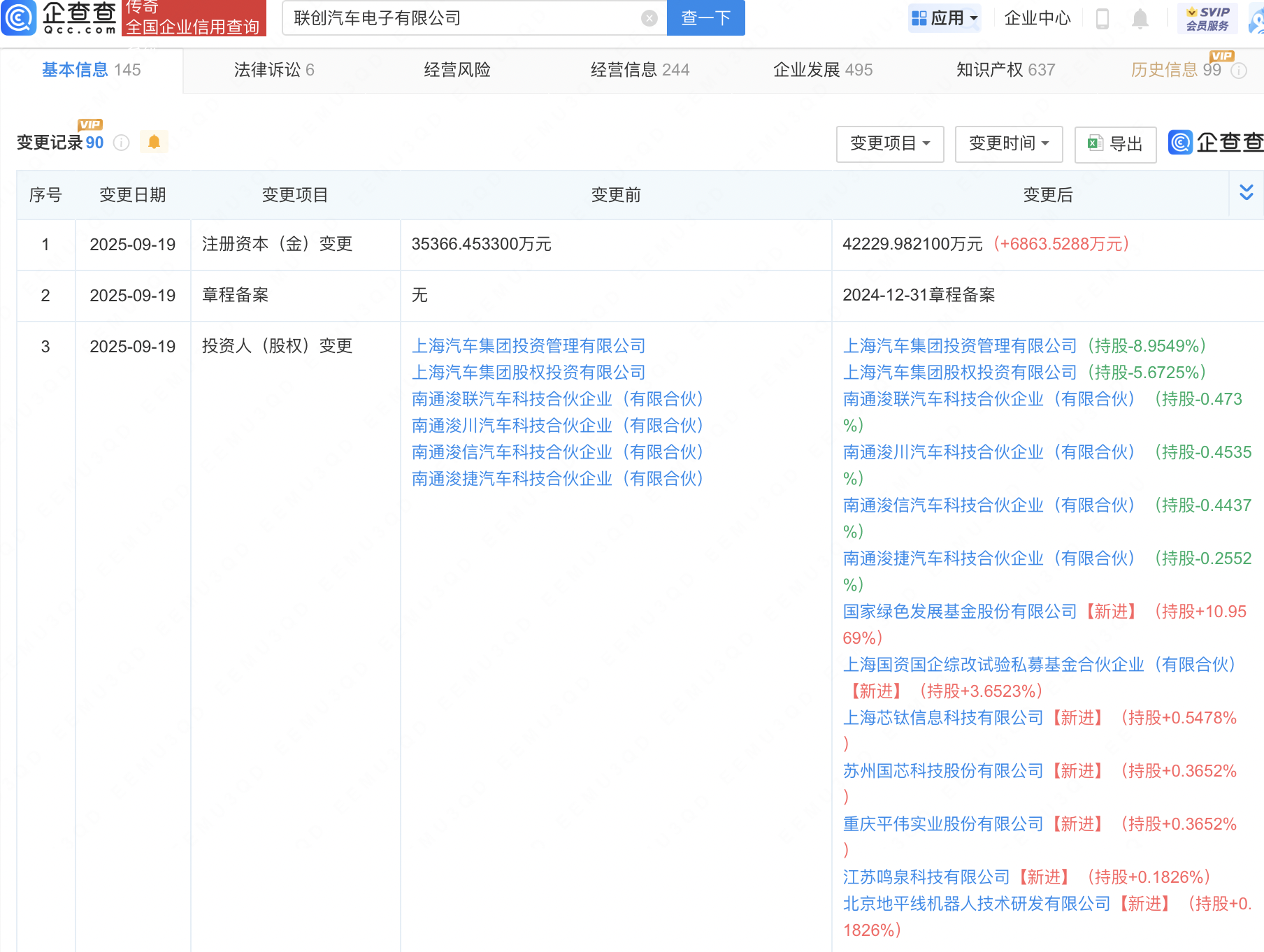 企查查APP显示,近日,联创汽车电子有限公司发生工商变更,新增国家绿色发展基金股份有限公司、北京地平线机器人技术研发有限公司、国芯科技(688262)等为股东,同时注册资本增至4.22亿元。企查查信息显示,该公司成立于2006年,经营范围含新能源汽车零部件、清洁能源汽车零部件的研发、生产、销售等,上汽集团(600104)对其间接持有约75%的股份。公开信息显示,联创汽车电子专注于汽车智能网联控制系统。