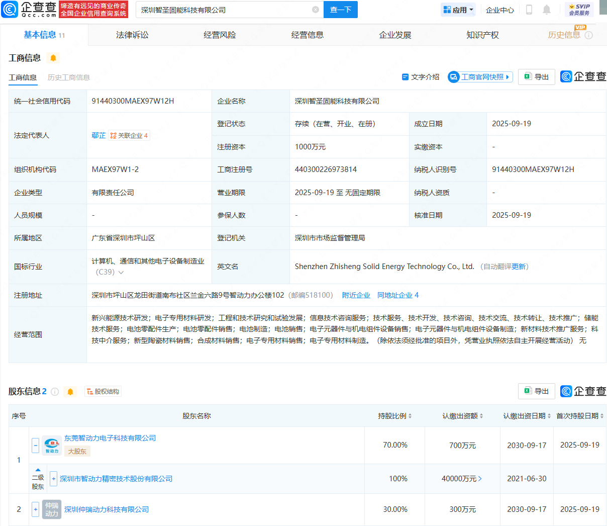 企查查APP显示,近日,深圳智圣固能科技有限公司成立,法定代表人为鄢芷,注册资本为1000万元,经营范围包含:新兴能源技术研发;电子专用材料研发;电池零配件生产;电池零配件销售;电池制造等。企查查股权穿透显示,该公司由智动力(300686)全资子公司东莞智动力电子科技有限公司、深圳仲瑞动力科技有限公司共同持股。