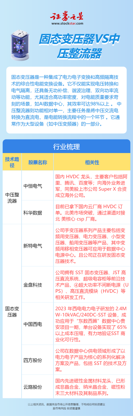 从产业链分工看,SST与HVDC的竞争背后是材料、元器件与系统集成的综合较量。云路股份等先进磁性金属材料厂商,其非晶、纳米晶产品是SST提升频率和效率的关键。而在HVDC领域,招商证券的分析指出,随着技术演进,中国企业在电力电子技术方面积累的优势,使其有望通过代工或合作开发方式进入海外供应链体系。