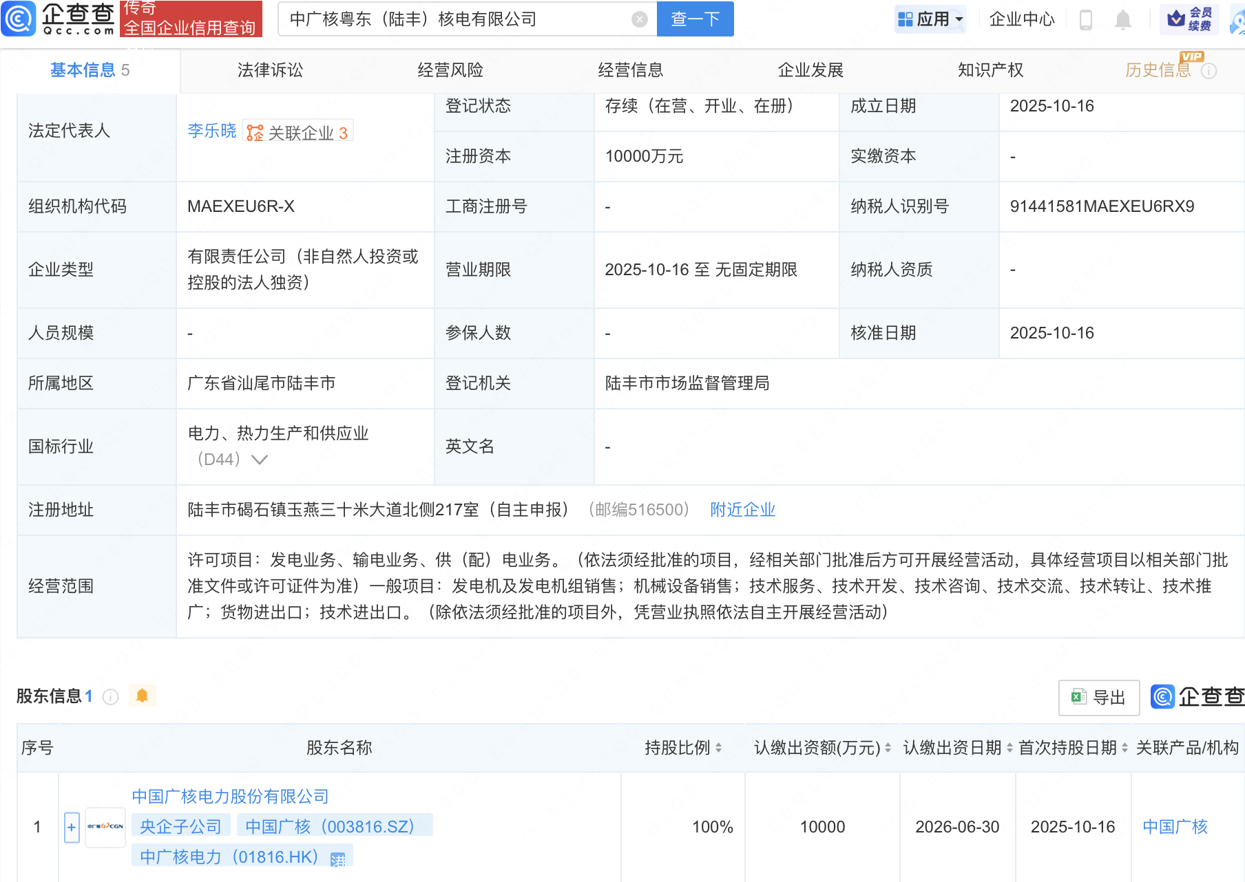企查查APP显示,近日,中广核粤东(陆丰)核电有限公司成立,注册资本1亿元,经营范围包含:发电机及发电机组销售;机械设备销售等。企查查股权穿透显示,该公司由中国广核(003816)全资持股。