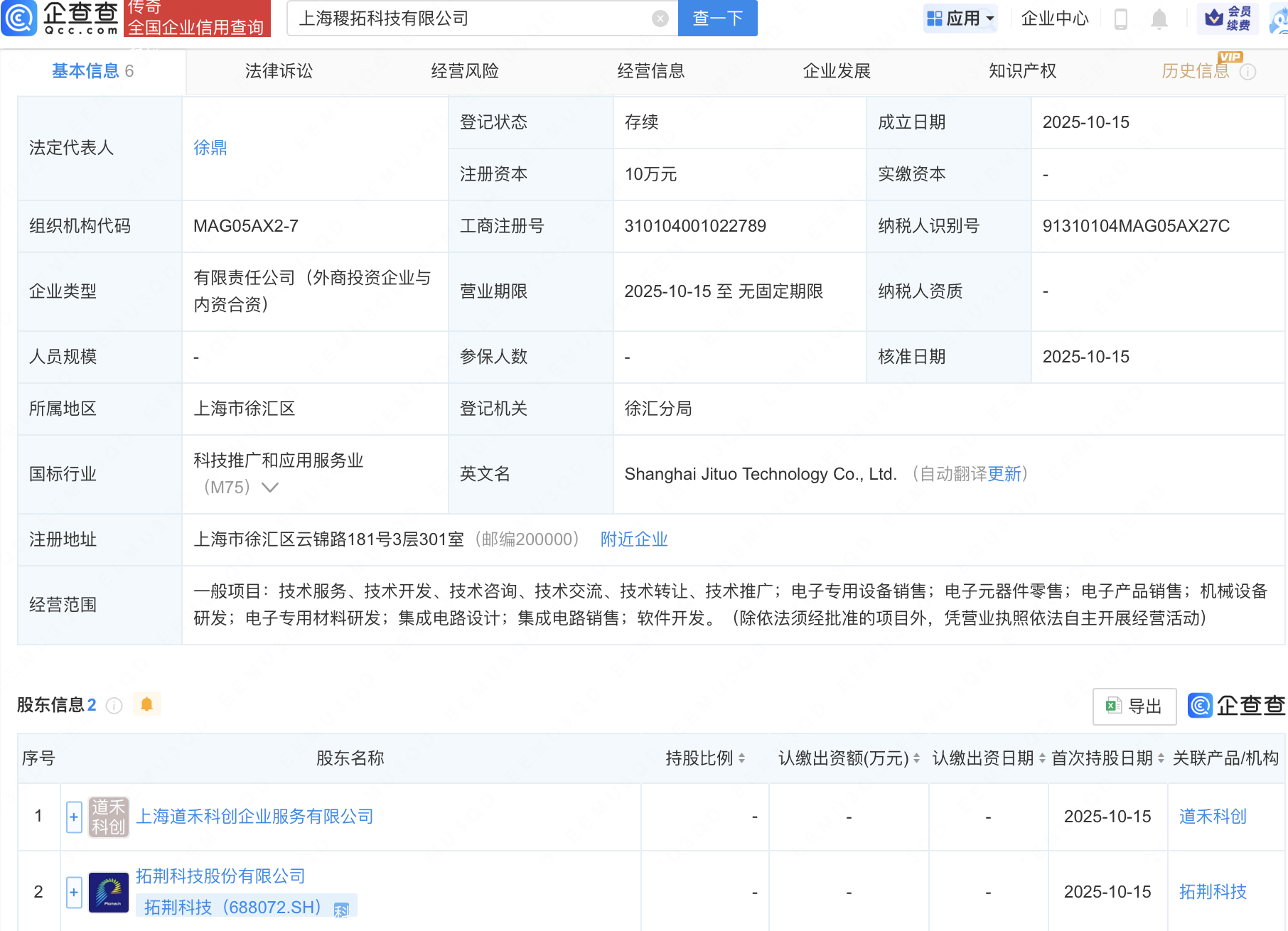 企查查APP显示,近日,上海稷拓科技有限公司成立,经营范围包含:电子专用材料研发;集成电路设计;集成电路销售;软件开发等。企查查股权穿透显示,该公司由拓荆科技(688072)等共同持股。