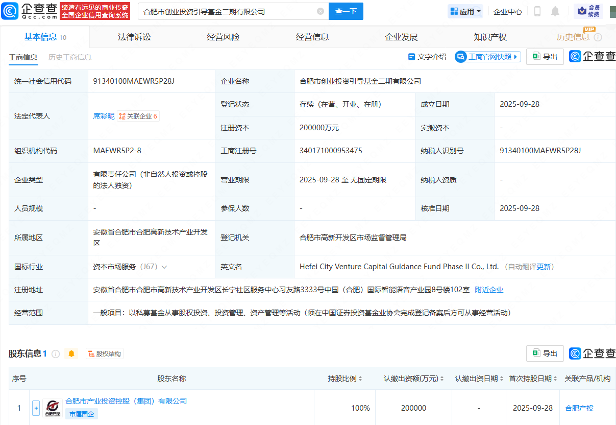 企查查APP显示,近日,合肥市创业投资引导基金二期有限公司成立,法定代表人为席彩昵,注册资本为20亿元,经营范围包含:以私募基金从事股权投资、投资管理、资产管理等活动。企查查股权穿透显示,该公司由合肥市产业投资控股(集团)有限公司全资持股。