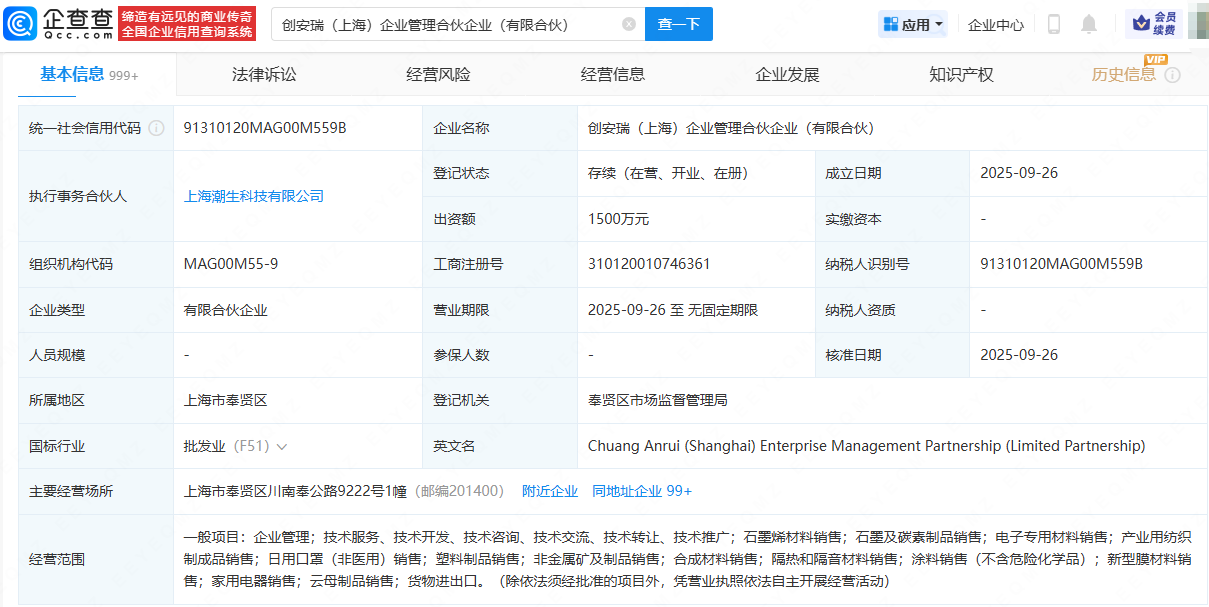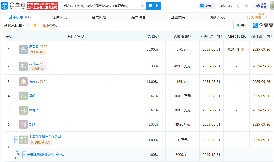 企查查APP显示,近日,创安瑞(上海)企业管理合伙企业(有限合伙)成立,出资额1500万,经营范围包含:石墨烯材料销售;石墨及碳素制品销售;电子专用材料销售;产业用纺织制成品销售;塑料制品销售等。企查查股权穿透显示,该公司由焦岩岩、宝泰隆(601011)全资子公司上海潮生科技有限公司等共同持股。
