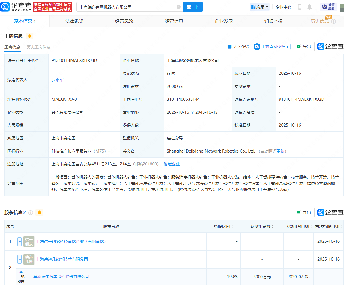 企查查APP显示,近日,上海德迩象网机器人有限公司成立,法定代表人为罗来军,注册资本为2000万元,经营范围包含:智能机器人的研发;智能机器人销售;工业机器人销售;服务消费机器人销售;人工智能硬件销售等。企查查股权穿透显示,该公司由上海德一创驭科技合伙企业(有限合伙)、德尔股份(300473)全资子公司上海德迩几微新技术有限公司共同持股。