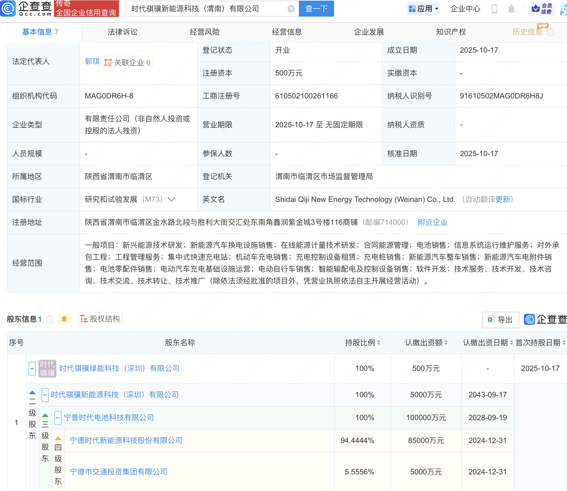 企查查APP显示,近日,时代骐骥新能源科技(渭南)有限公司成立,经营范围包含:新兴能源技术研发;新能源汽车换电设施销售;在线能源计量技术研发;合同能源管理;电池销售等。企查查股权穿透显示,该公司由宁德时代(300750)旗下时代骐骥绿能科技(深圳)有限公司全资持股。