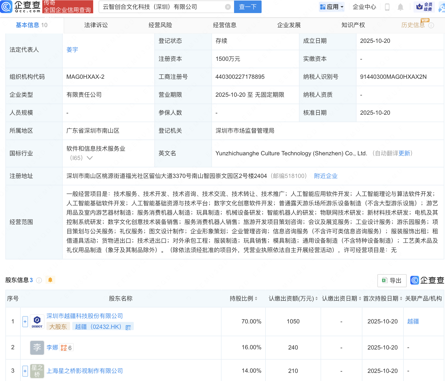 企查查APP显示,近日,云智创合文化科技(深圳)有限公司成立,注册资本1500万元,经营范围包含:人工智能应用软件开发;人工智能理论与算法软件开发;人工智能基础软件开发;智能机器人的研发;物联网技术研发等。企查查股权穿透显示,该公司由越疆(02432.HK)等共同持股。