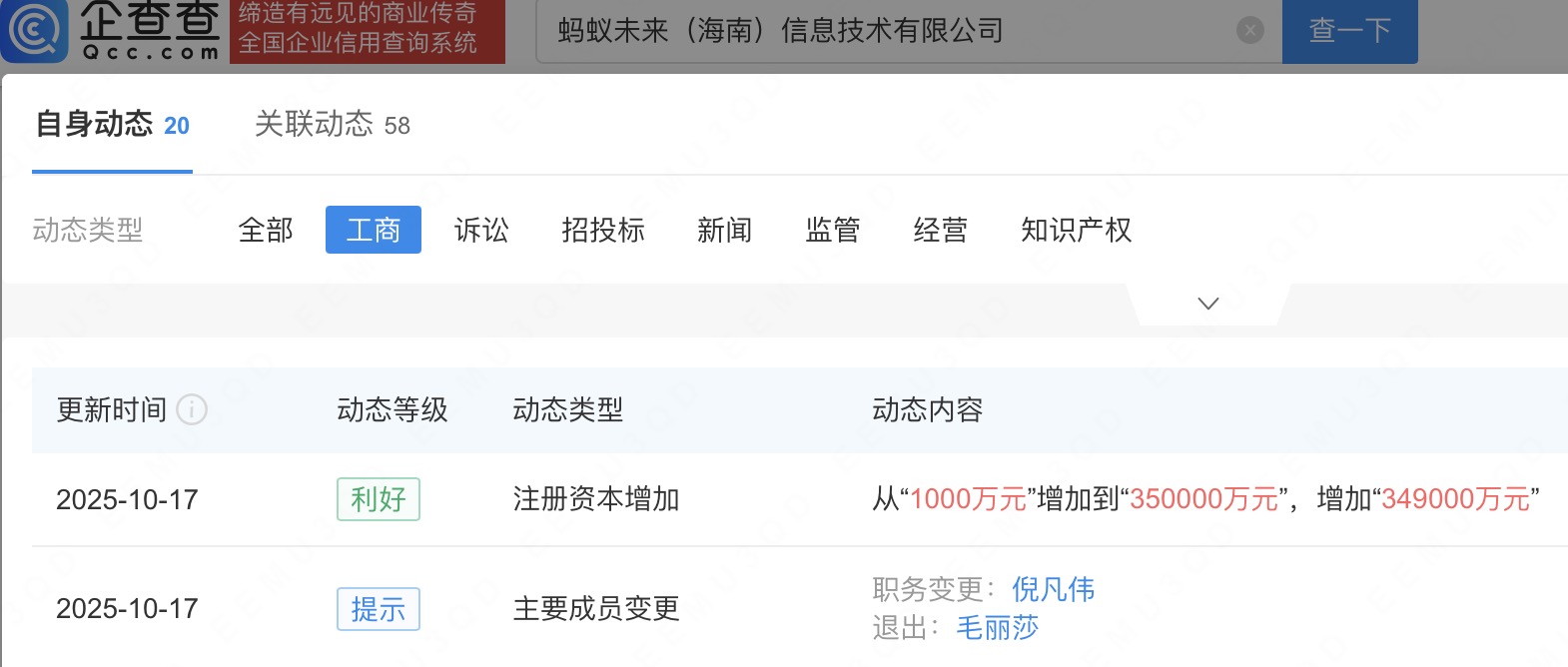 蚂蚁集团旗下海南信息技术公司增资至35亿