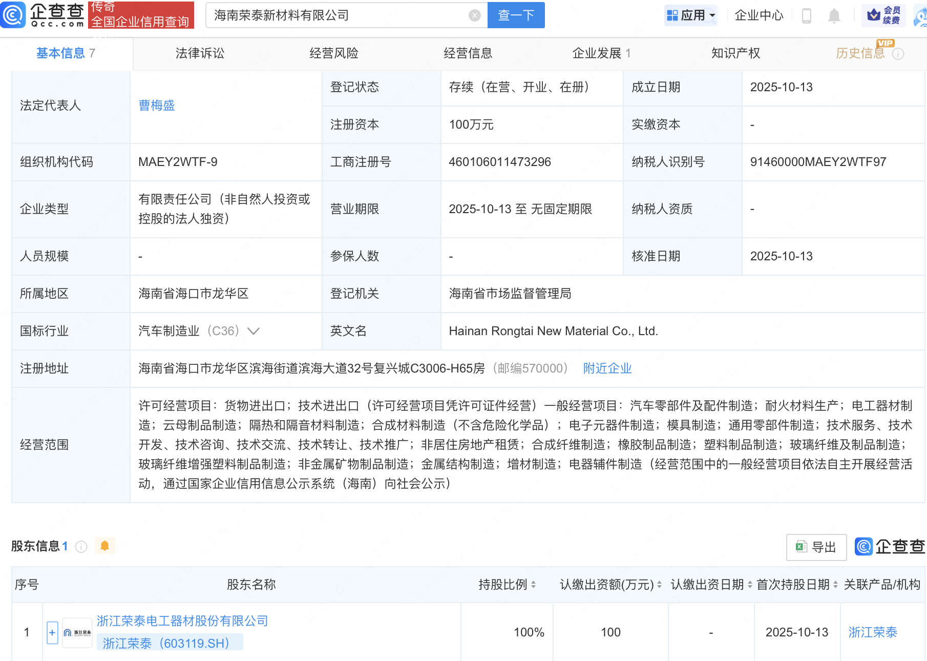 企查查APP显示,近日,海南荣泰新材料有限公司成立,法定代表人为曹梅盛,经营范围包含:塑料制品制造;玻璃纤维及制品制造;玻璃纤维增强塑料制品制造;非金属矿物制品制造等。企查查股权穿透显示,该公司由浙江荣泰(603119)全资持股。