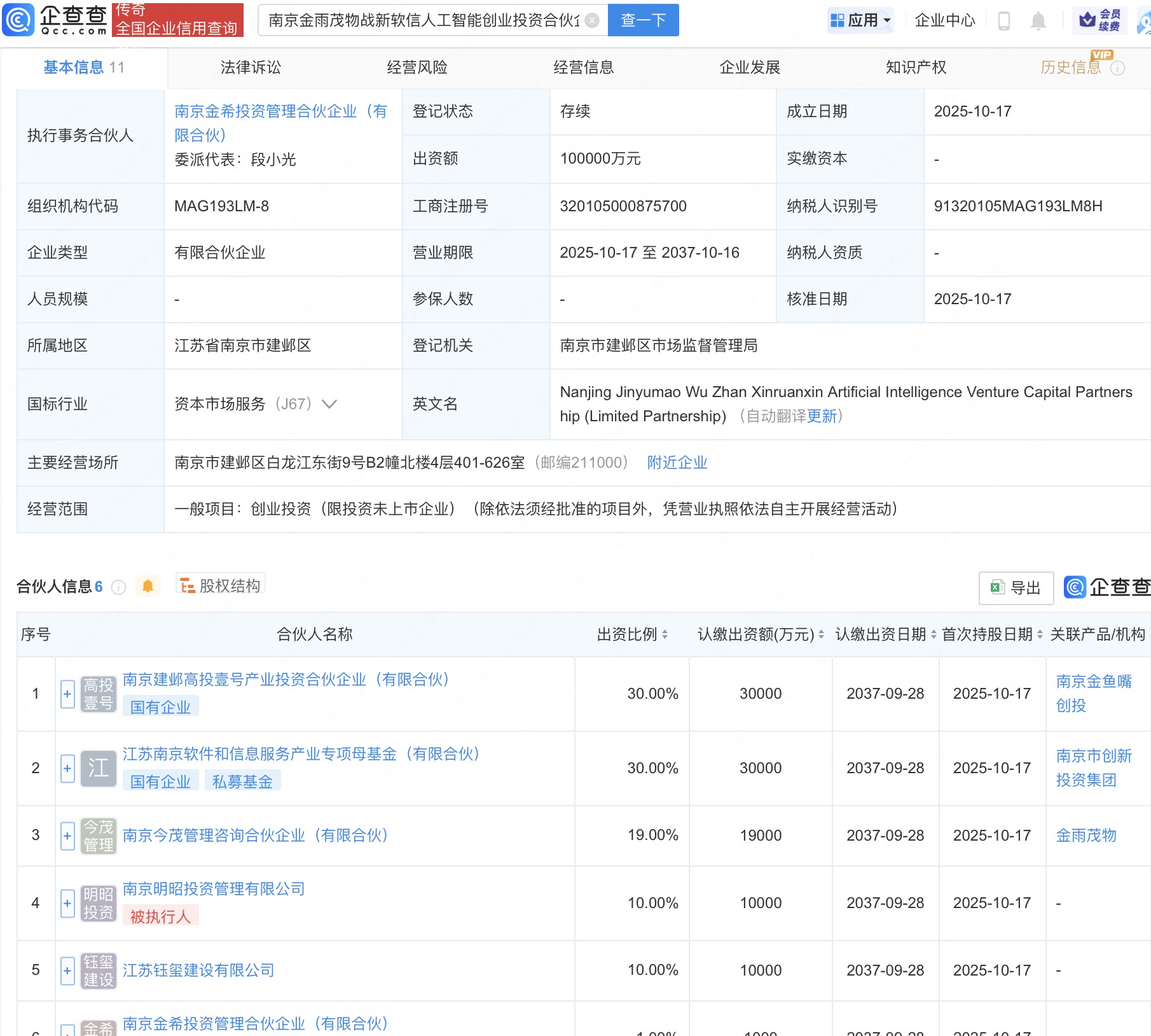 企查查APP显示,近日,南京金雨茂物战新软信人工智能创业投资合伙企业(有限合伙)成立,出资额10亿人民币,经营范围为创业投资。企查查股权穿透显示,该企业由江苏南京软件和信息服务产业专项母基金(有限合伙)等共同出资。