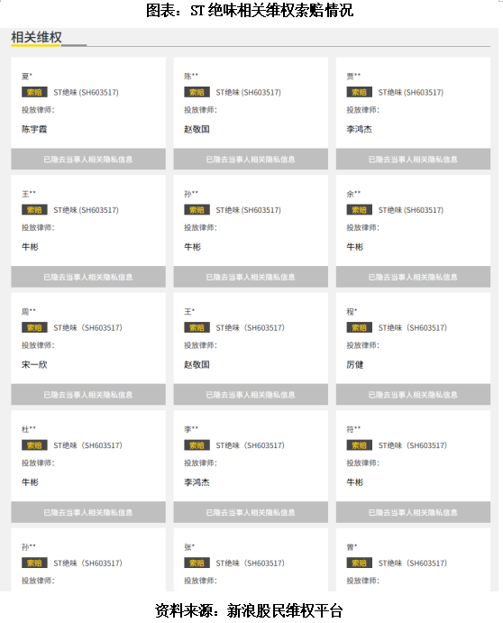 10月16日,时代商业研究院查询新浪股民维权平台显示,目前已有部分股民向ST绝味进行维权索赔并获律师受理,索赔条件2018年4月16日到2024年8月15日之间买入股票且在2024年8月1日收盘时卖出或仍持有。