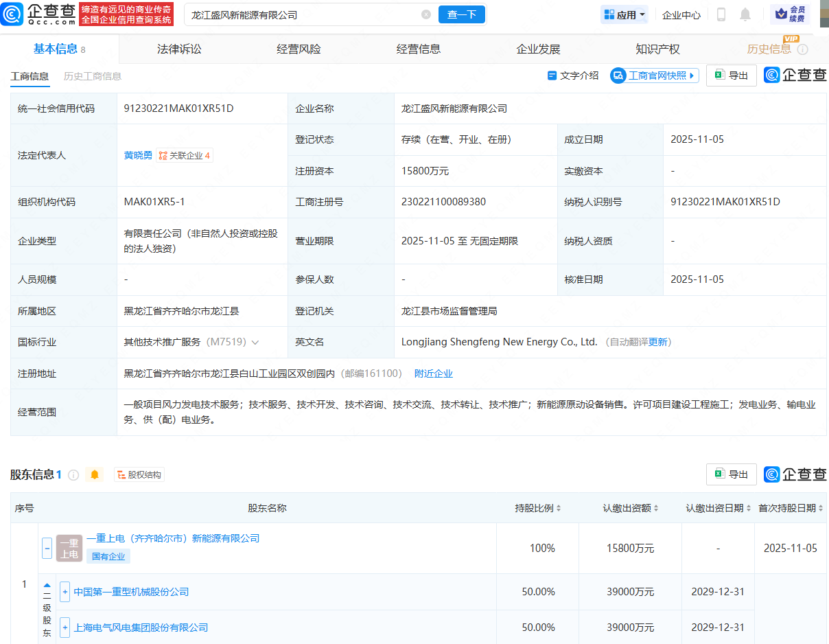 企查查APP显示,近日,龙江盛风新能源有限公司成立,法定代表人为黄晓勇,注册资本为1.58亿元,经营范围包含:风力发电技术服务;新能源原动设备销售;建设工程施工;发电业务、输电业务、供(配)电业务等。企查查股权穿透显示,该公司由一重上电(齐齐哈尔市)新能源有限公司全资持股,后者由中国一重(601106)、电气风电(688660)共同持股。