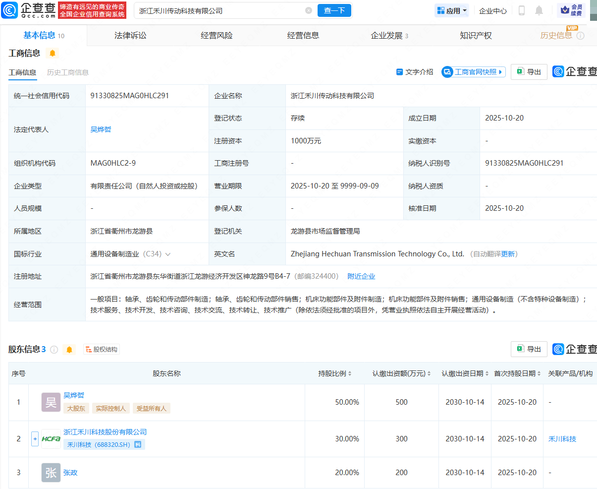 企查查APP显示,近日,浙江禾川传动科技有限公司成立,法定代表人为吴烨哲,注册资本为1000万元,经营范围包含:轴承、齿轮和传动部件制造;机床功能部件及附件制造;机床功能部件及附件销售;通用设备制造等。企查查股权穿透显示,该公司由吴烨哲、禾川科技(688320)等共同持股。