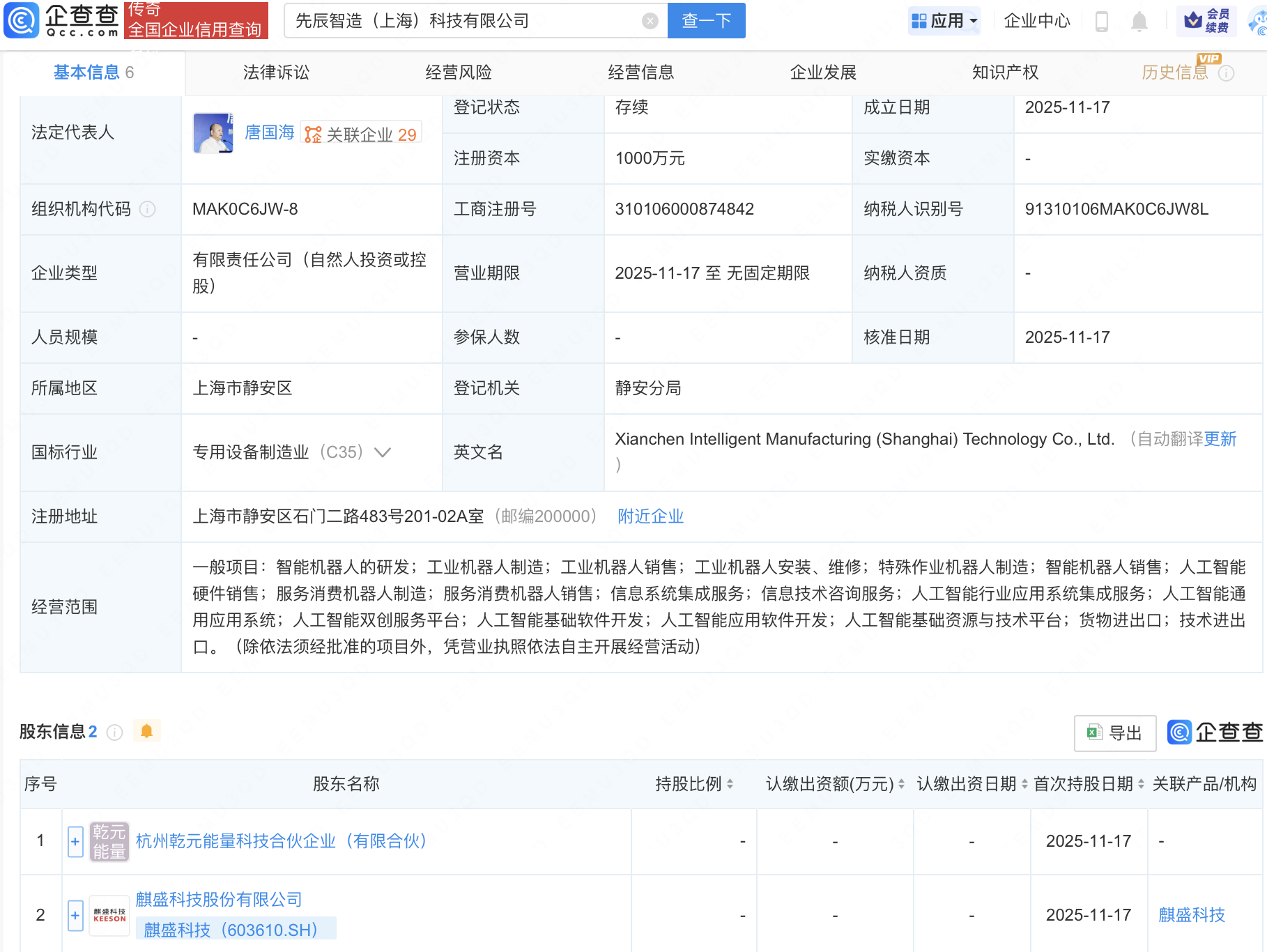 企查查APP显示,近日,先辰智造(上海)科技有限公司成立,注册资本1000万元,经营范围包含:智能机器人的研发;工业机器人制造;人工智能行业应用系统集成服务;人工智能通用应用系统;人工智能双创服务平台等。企查查股权穿透显示,该公司由麒盛科技(603610)等共同持股。
