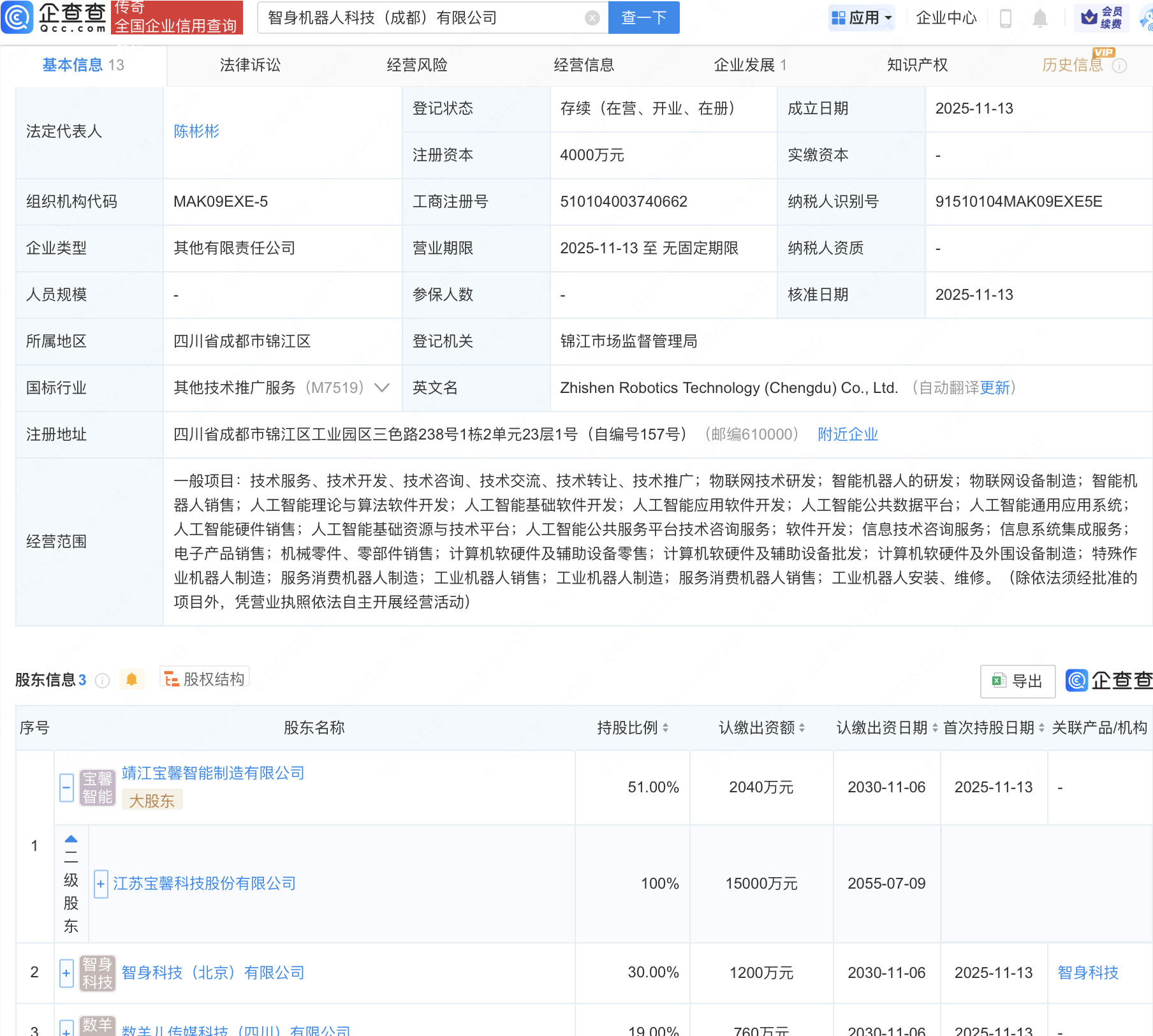 企查查APP显示,近日,智身机器人科技(成都)有限公司成立,注册资本4000万元,经营范围包含:物联网技术研发;智能机器人的研发;人工智能应用软件开发;人工智能公共数据平台等。企查查股权穿透显示,该公司由宝馨科技(002514)全资子公司靖江宝馨智能制造有限公司等共同持股。