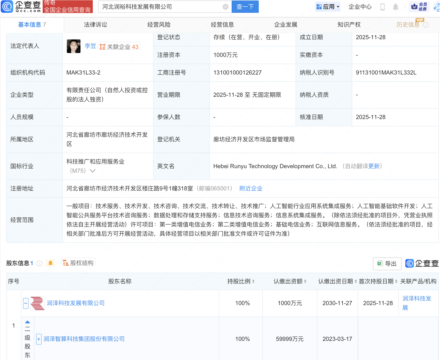 企查查APP显示,近日,河北润裕科技发展有限公司成立,注册资本1000万元,经营范围包含:人工智能行业应用系统集成服务;人工智能基础软件开发;人工智能公共服务平台技术咨询服务;数据处理和存储支持服务等。企查查股权穿透显示,该公司由润泽科技(300442)间接全资持股。