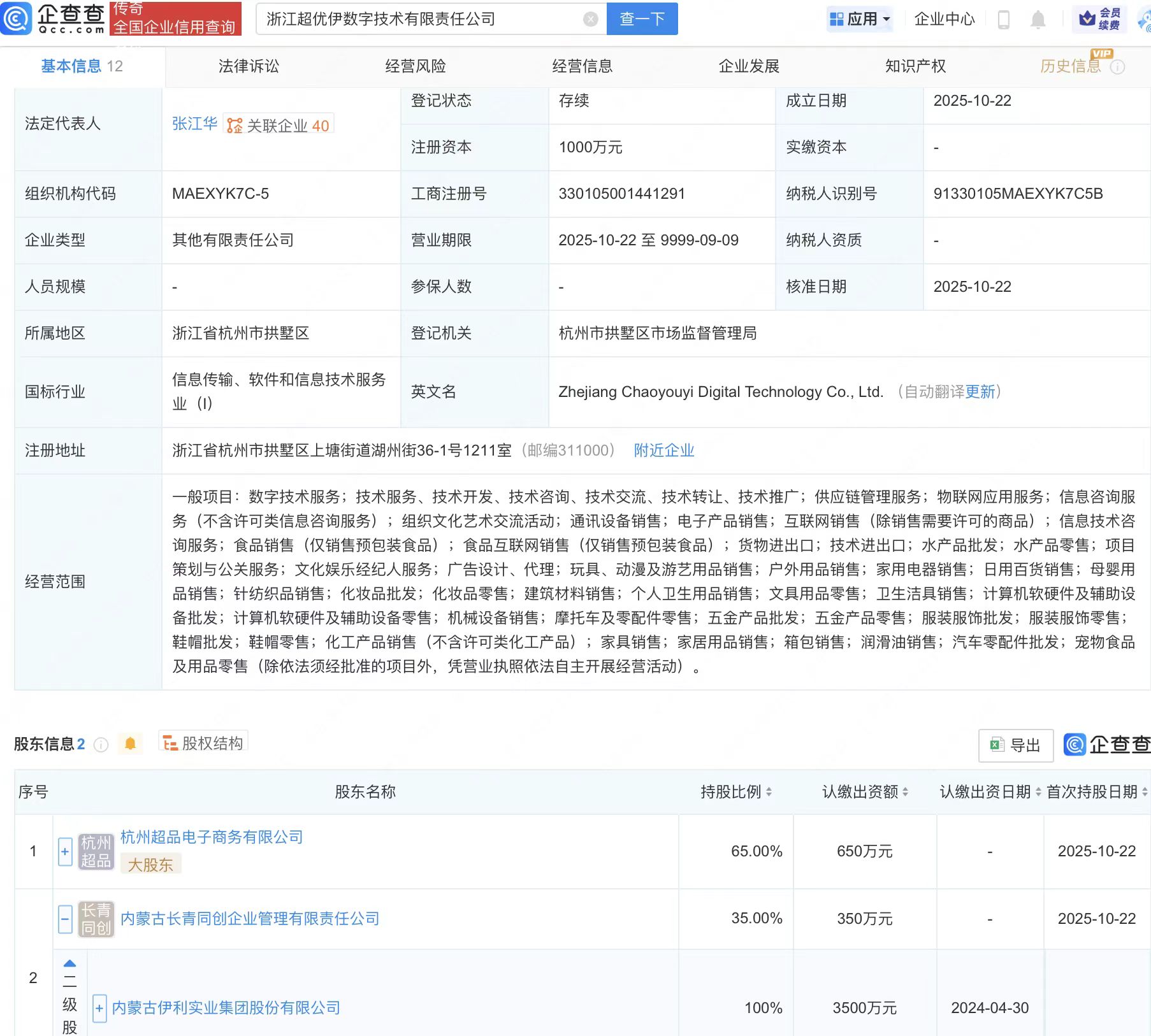 企查查APP显示,浙江超优伊数字技术有限责任公司成立,注册资本1000万元,经营范围包含:供应链管理服务;物联网应用服务;组织文化艺术交流活动;通讯设备销售等。企查查股权穿透显示,该公司由伊利股份(600887)全资子公司内蒙古长青同创企业管理有限责任公司等共同持股。