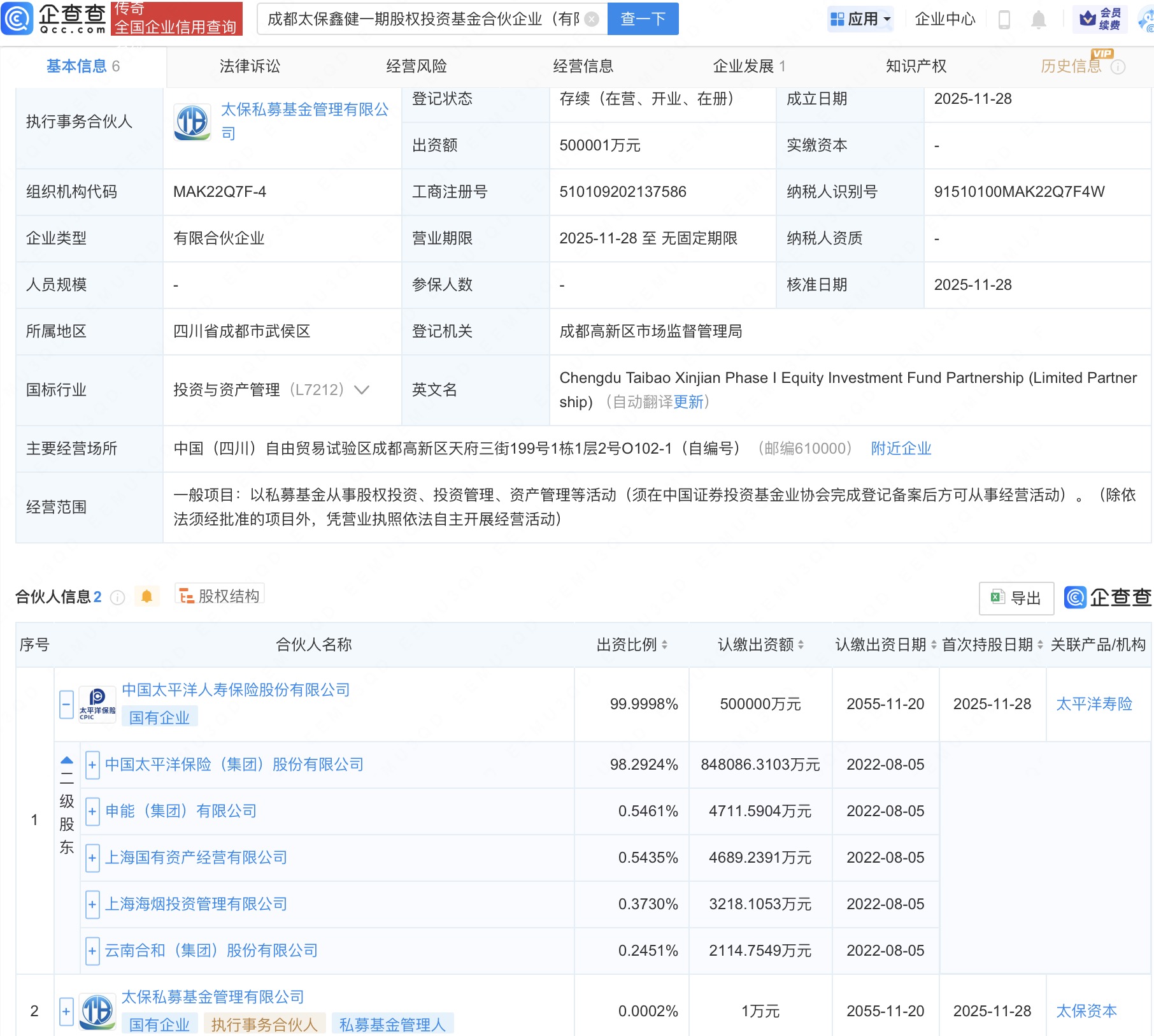 企查查APP显示,近日,成都太保鑫健一期股权投资基金合伙企业(有限合伙)成立,出资额约50亿元,经营范围包括以私募基金从事股权投资、投资管理、资产管理等活动。企查查股权穿透显示,该企业由中国太保(601601)旗下中国太平洋人寿保险股份有限公司、太保私募基金管理有限公司共同出资。