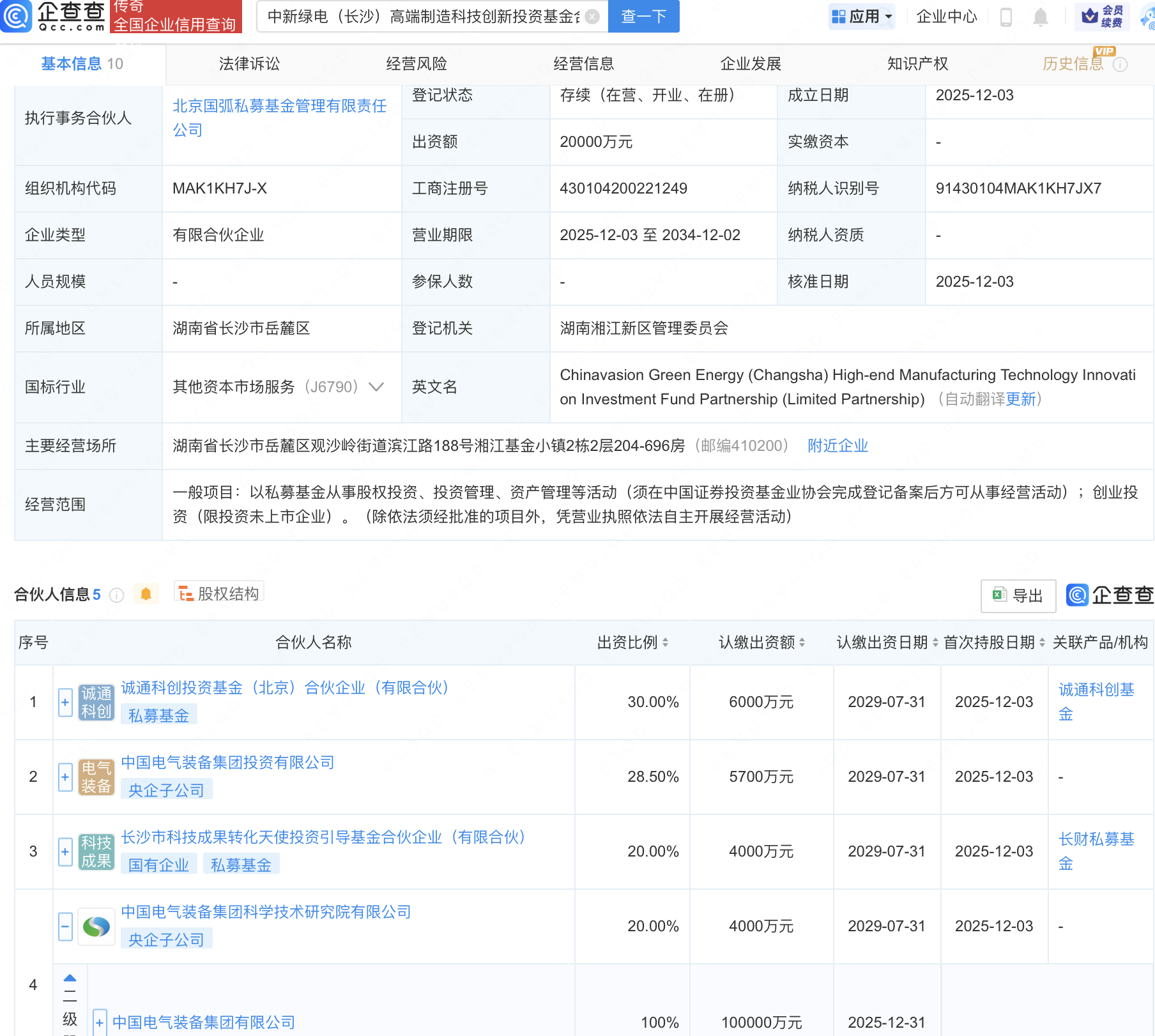 企查查APP显示,近日,中新绿电(长沙)高端制造科技创新投资基金合伙企业(有限合伙)成立,出资额2亿元,经营范围包含:以私募基金从事股权投资、投资管理、资产管理等活动。企查查股权穿透显示,该企业由诚通科创投资基金(北京)合伙企业(有限合伙)、中国电气装备集团有限公司全资子公司中国电气装备集团科学技术研究院有限公司等共同出资。