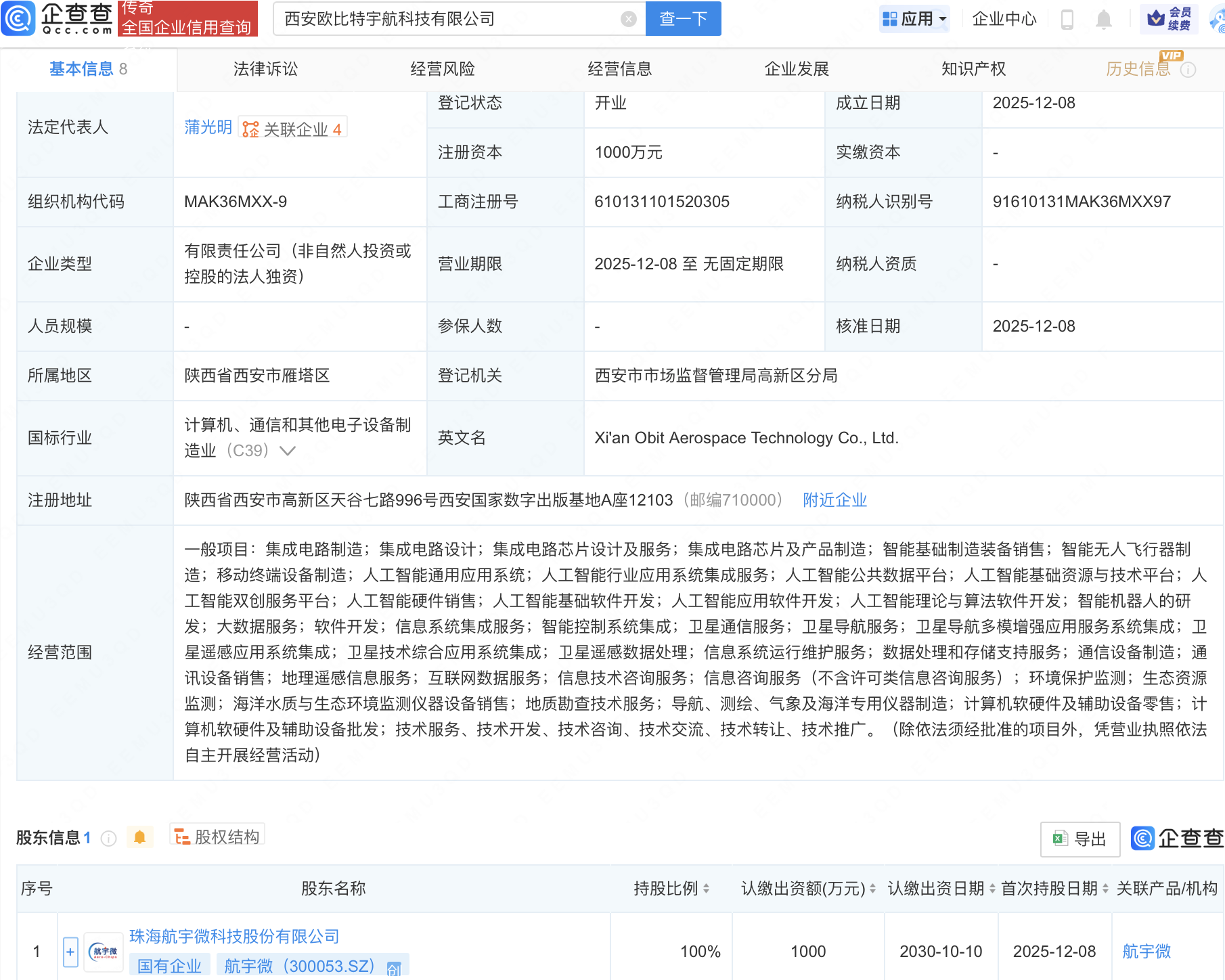企查查APP显示,近日,西安欧比特宇航科技有限公司成立,注册资本1000万元,经营范围包含:集成电路芯片设计及服务;集成电路芯片及产品制造;人工智能应用软件开发;人工智能理论与算法软件开发;智能机器人的研发等。企查查股权穿透显示,该公司由航宇微(300053)全资持股。
