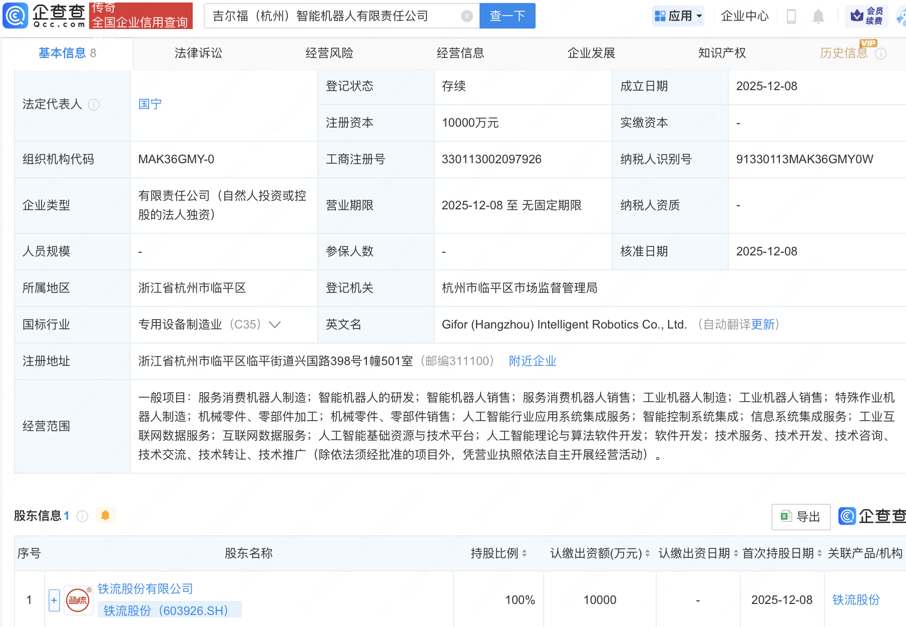 企查查APP显示,近日,吉尔福(杭州)智能机器人有限责任公司成立,注册资本1亿元,经营范围包含:智能机器人的研发;智能机器人销售;人工智能行业应用系统集成服务;人工智能基础资源与技术平台;人工智能理论与算法软件开发等。企查查股权穿透显示,该公司由铁流股份(603926)全资持股。