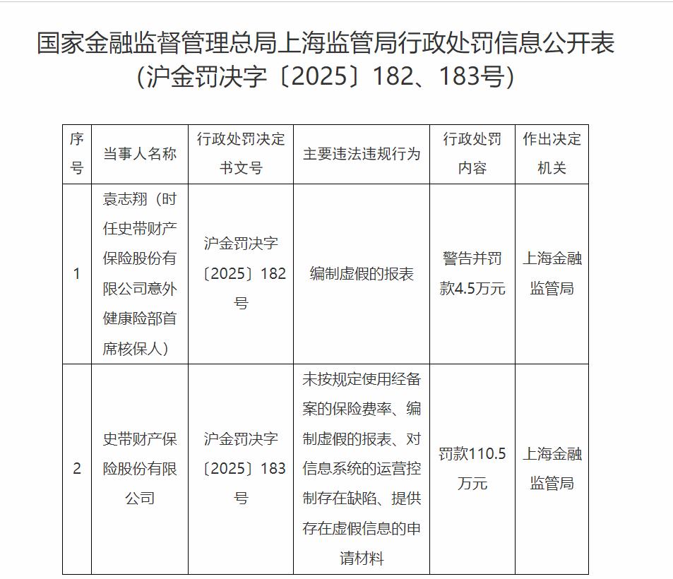 其中,史带财险因存在未按规定使用备案保险费率、编制虚假报表、信息系统存在缺陷、提交虚假申请材料等四项违规行为,被处以110.5万元罚款(处罚文号:沪金罚决字〔2025〕183号);时任史带财险意外健康险部首席核保人袁志翔也因编制虚假报表,被给予警告并罚款4.5万元(处罚文号:沪金罚决字〔2025〕182号)。