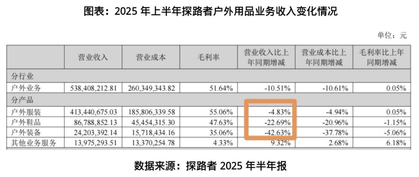 然而,好景不长。2025年三季报显示,探路者前三季度实现营业收入9.53亿元,同比下降13.98%;扣非净利润为2694万元,同比暴跌70.46%。值得一提的是,营收占比约80%的户外用品业务,受市场环境变化及新品迭代不及预期影响,销售持续承压。2025年半年报显示,上半年,探路者的户外服装营业收入同比下滑4.83%,户外鞋品营业收入同比下滑22.69%,户外装备营业收入同比下滑42.63%,核心品类增长乏力。