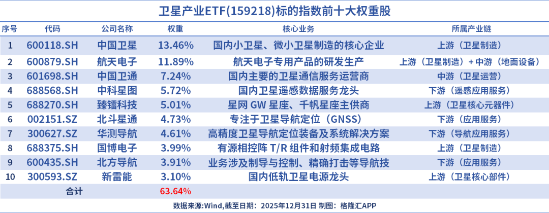 前十大权重股囊括卫星产业链上游的航天电子、中国卫星、中游的中国卫通,以及下游的华测导航、北斗星通等,合计权重超60%。