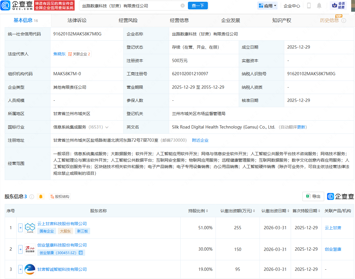 企查查APP显示,近日,丝路数康科技(甘肃)有限责任公司成立,法定代表人为焦晓东,经营范围包含:大数据服务;软件开发;人工智能应用软件开发;人工智能理论与算法软件开发;人工智能公共数据平台等。企查查股权穿透显示,该公司由云上甘肃科技股份有限公司、创业慧康(300451)等共同持股。
