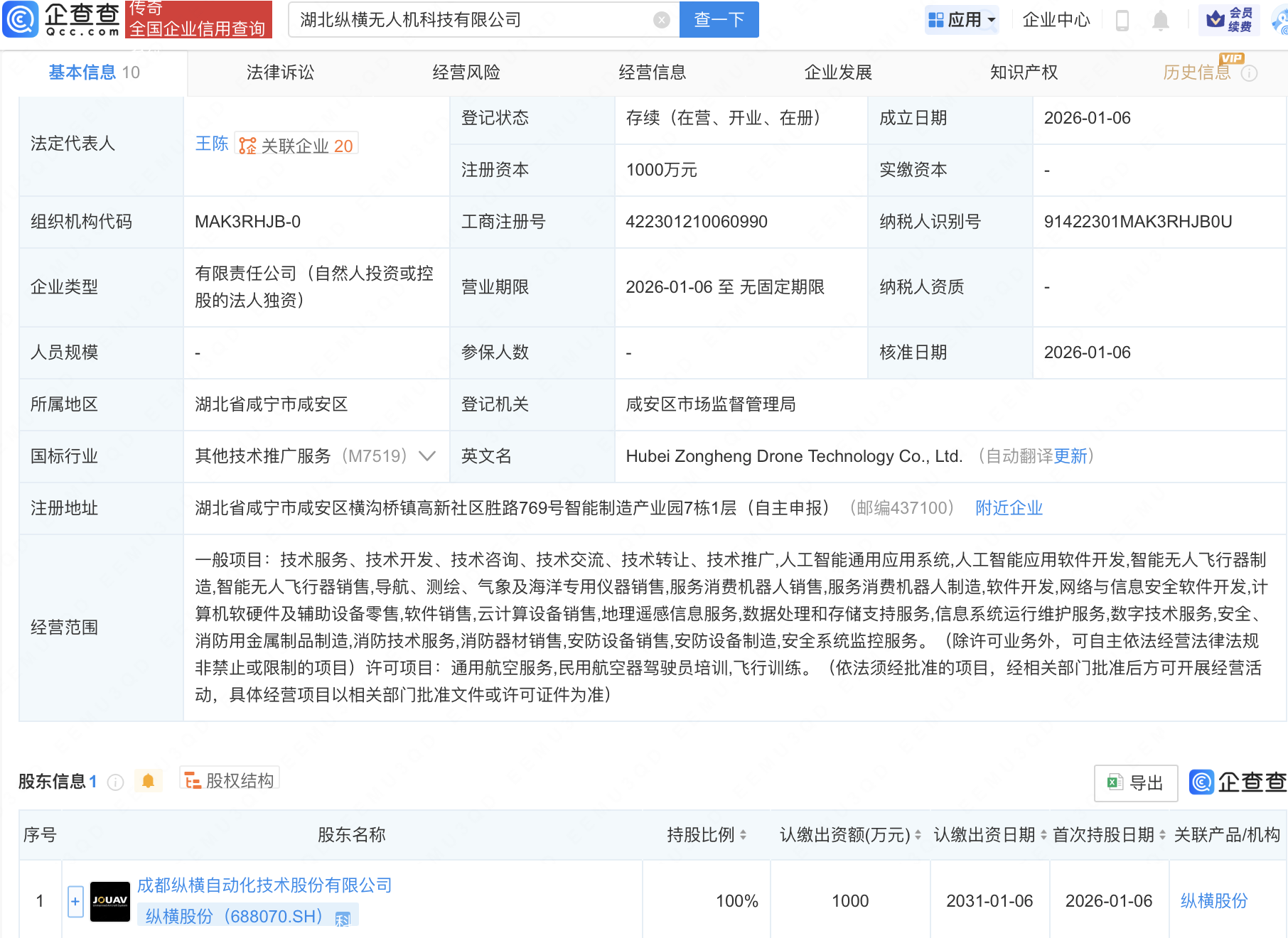 企查查APP显示,近日,湖北纵横无人机科技有限公司成立,注册资本1000万元,经营范围包含:人工智能通用应用系统;人工智能应用软件开发;智能无人飞行器制造;通用航空服务;民用航空器驾驶员培训等。企查查股权穿透显示,该公司由纵横股份(688070)全资持股。
