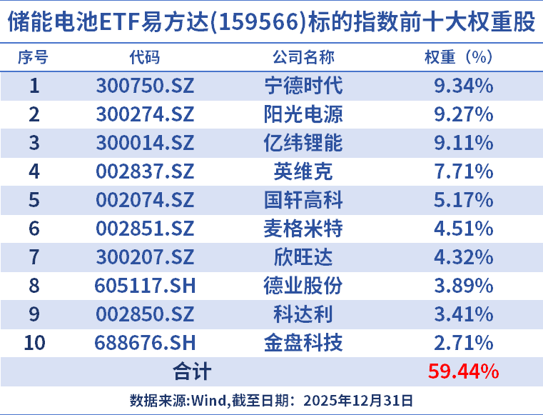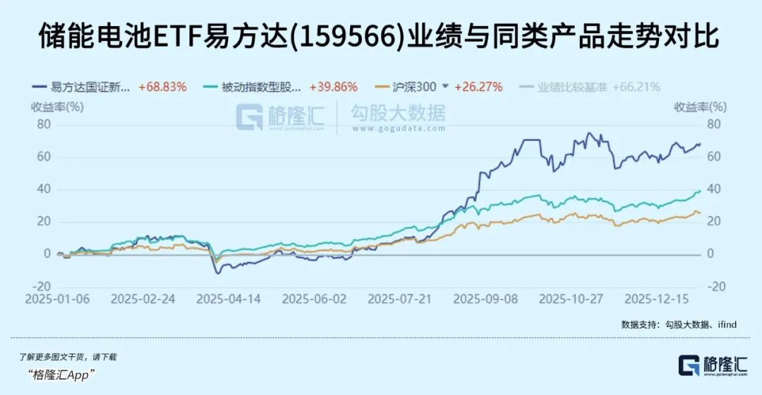 反映在资本市场上,这些核心巨头的经营业绩强劲发展势能,也让储能板块在资本市场表现在一众硬科技赛道中脱颖而出,2025年,国证新能源电池指数强势上涨55.15%,显著跑赢多数行业。跟踪这一指数的储能电池ETF易方达(159566)实现量价齐涨,全年强势上涨57.96%。