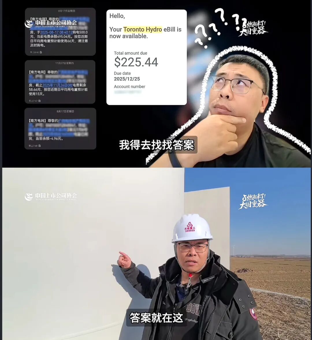 @域外编纂者 则是对比了中国和加拿大的电费单,带着“在中国500块的电费三个月都没用完,但在加拿大一个月就要1300多块,为啥差距这么大”的好奇,走进天能重工赵虎风电厂里,寻找答案。