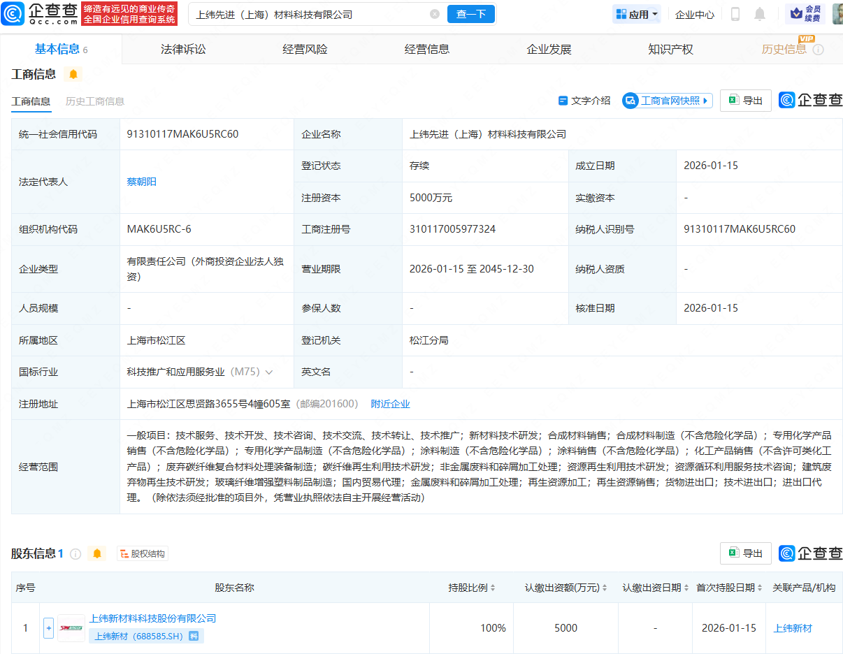 企查查APP显示,近日,上纬先进(上海)材料科技有限公司成立,法定代表人为蔡朝阳,注册资本为5000万元,经营范围包含:新材料技术研发;合成材料销售;碳纤维再生利用技术研发;非金属废料和碎屑加工处理等。企查查股权穿透显示,该公司由上纬新材(688585)全资持股。