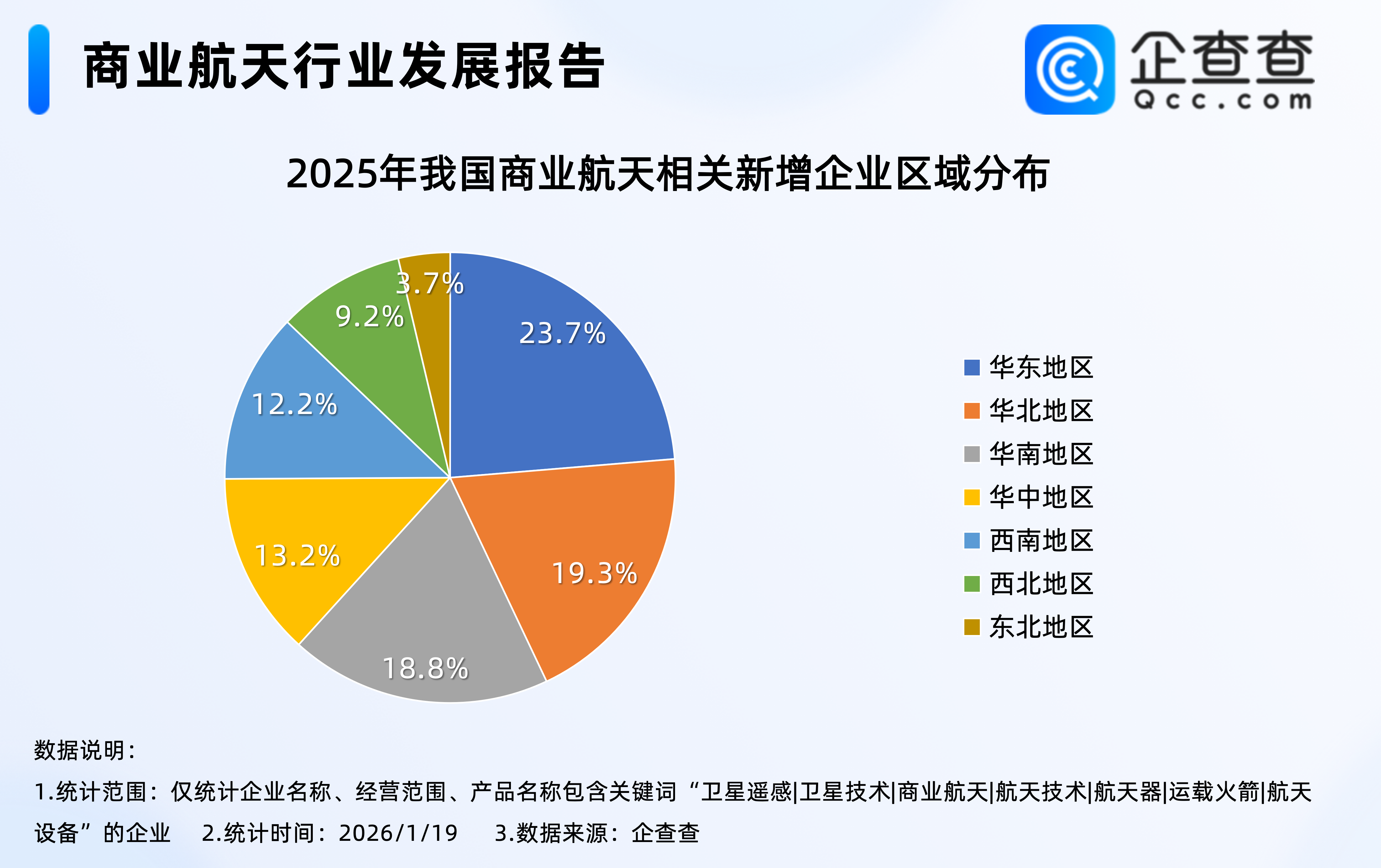 企查查数据显示,2025年注册的2.57万家商业航天相关企业中,位于华东地区的相关企业最多,占比23.7%,其次是华北地区,占比19.3%,东北地区相对最少,占比3.7%。