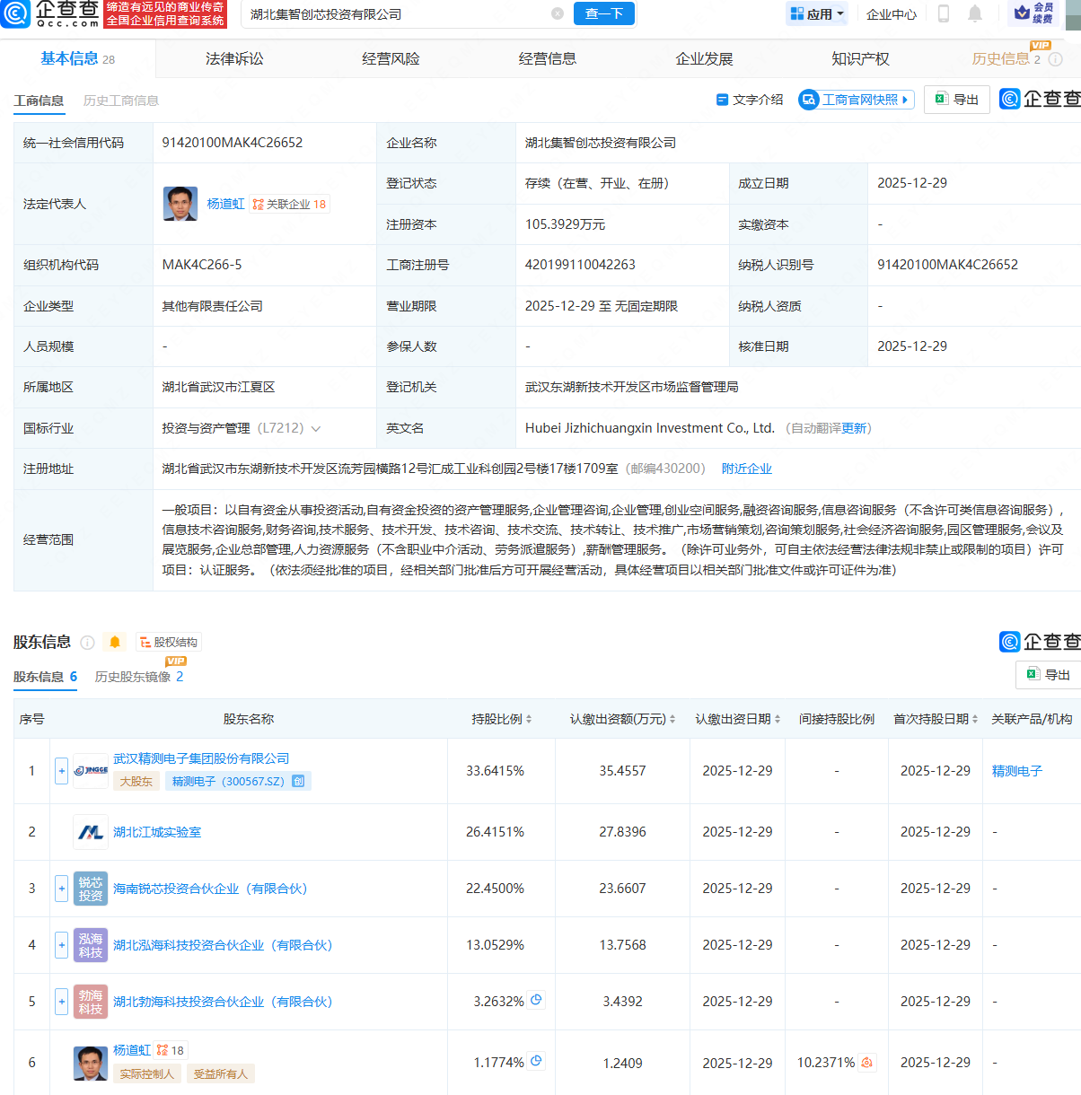 企查查APP显示,近日,湖北集智创芯投资有限公司成立,法定代表人为杨道虹,经营范围包含:以自有资金从事投资活动;企业管理咨询;企业管理;创业空间服务;融资咨询服务等。企查查股权穿透显示,该公司由精测电子(300567)、湖北江城实验室等共同持股。