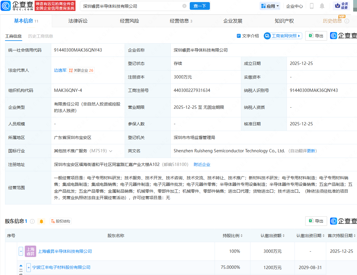 企查查APP显示,近日,深圳睿昇半导体科技有限公司成立,法定代表人为边逸军,注册资本为3000万元,经营范围包含:电子专用材料研发;新材料技术研发;电子专用材料制造;电子专用材料销售;集成电路制造等。企查查股权穿透显示,该公司由江丰电子(300666)旗下上海睿昇半导体科技有限公司全资持股。