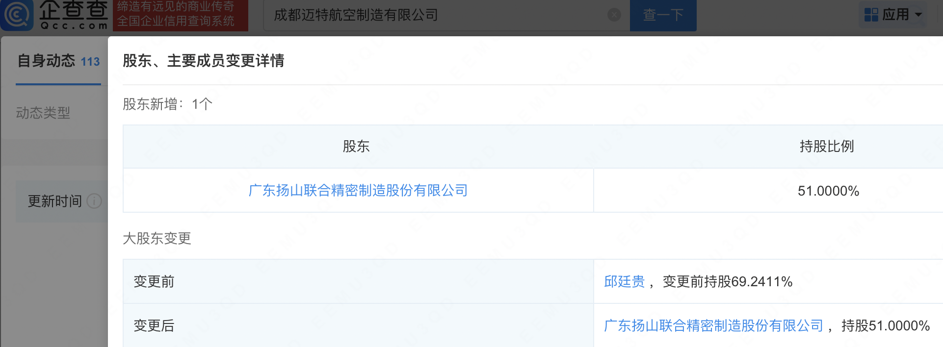 企查查APP显示,近日,成都迈特航空制造有限公司发生工商变更,新增联合精密(001268)为大股东,持股51%。企查查信息显示,该公司成立于2010年,经营范围包含:电子专用材料研发;新材料技术研发;机械设备研发;弹簧制造;金属链条及其他金属制品制造等。公开信息显示,成都迈特航空制造有限公司主要客户已覆盖国内航空航天、电子、船舶、兵器、信息等领域,是一家集科研、生产、检测于一体的高科技企业。