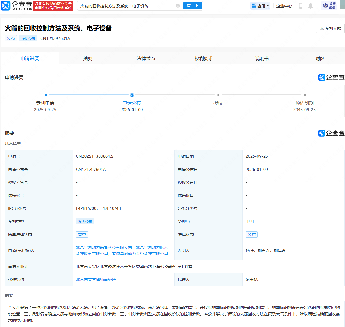 企查查APP显示,近日,北京星河动力航天科技股份有限公司申请公布“火箭的回收控制方法及系统、电子设备”专利。
