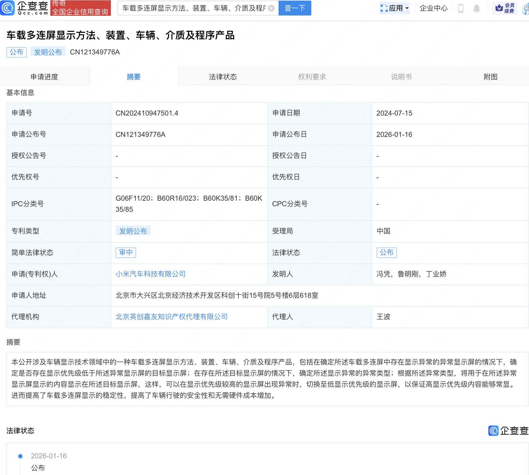 企查查APP显示,近日,小米汽车科技有限公司申请的“车载多连屏显示方法、装置、车辆、介质及程序产品”专利公布。企查查专利摘要显示,本公开涉及车辆显示技术领域,包括在确定所述车载多连屏中存在显示异常的异常显示屏的情况下,确定是否存在显示优先级低于所述异常显示屏的目标显示屏;在存在所述目标显示屏的情况下,确定所述显示异常的异常类型;根据所述异常类型,将用于在所述异常显示屏显示的内容显示在所述目标显示屏,这样,可以在显示优先级较高的显示屏出现异常时,切换至低显示优先级的显示屏,以保证高显示优先级内容能够常显。进而提高了车载多连屏显示的稳定性,提高了车辆行驶的安全性和无需硬件成本增加。