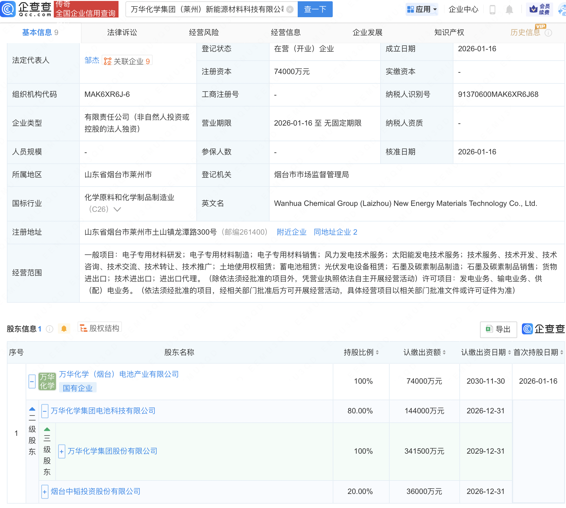 企查查APP显示,近日,万华化学集团(莱州)新能源材料科技有限公司成立,法定代表人为邹杰,注册资本7.4亿元,经营范围含电子专用材料研发、电子专用材料制造、电子专用材料销售、风力发电技术服务等。企查查股权穿透显示,该公司由万华化学(600309)旗下万华化学(烟台)电池产业有限公司全资持股。