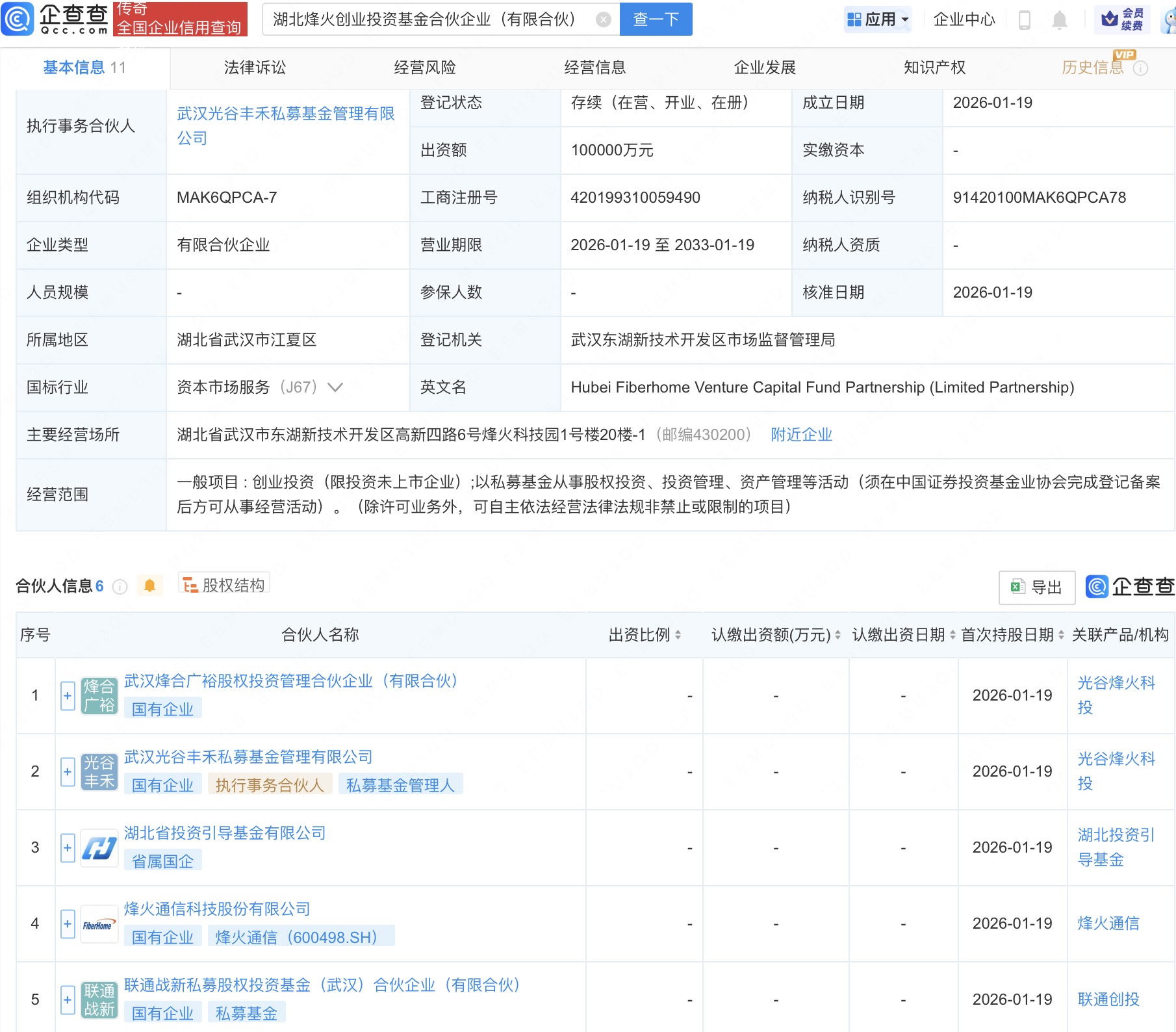 企查查APP显示,近日,湖北烽火创业投资基金合伙企业(有限合伙)成立,出资额10亿元,经营范围包含:创业投资(限投资未上市企业);以私募基金从事股权投资、投资管理、资产管理等活动。企查查股权穿透显示,该企业由烽火通信(600498)、联通战新私募股权投资基金(武汉)合伙企业(有限合伙)等共同出资。