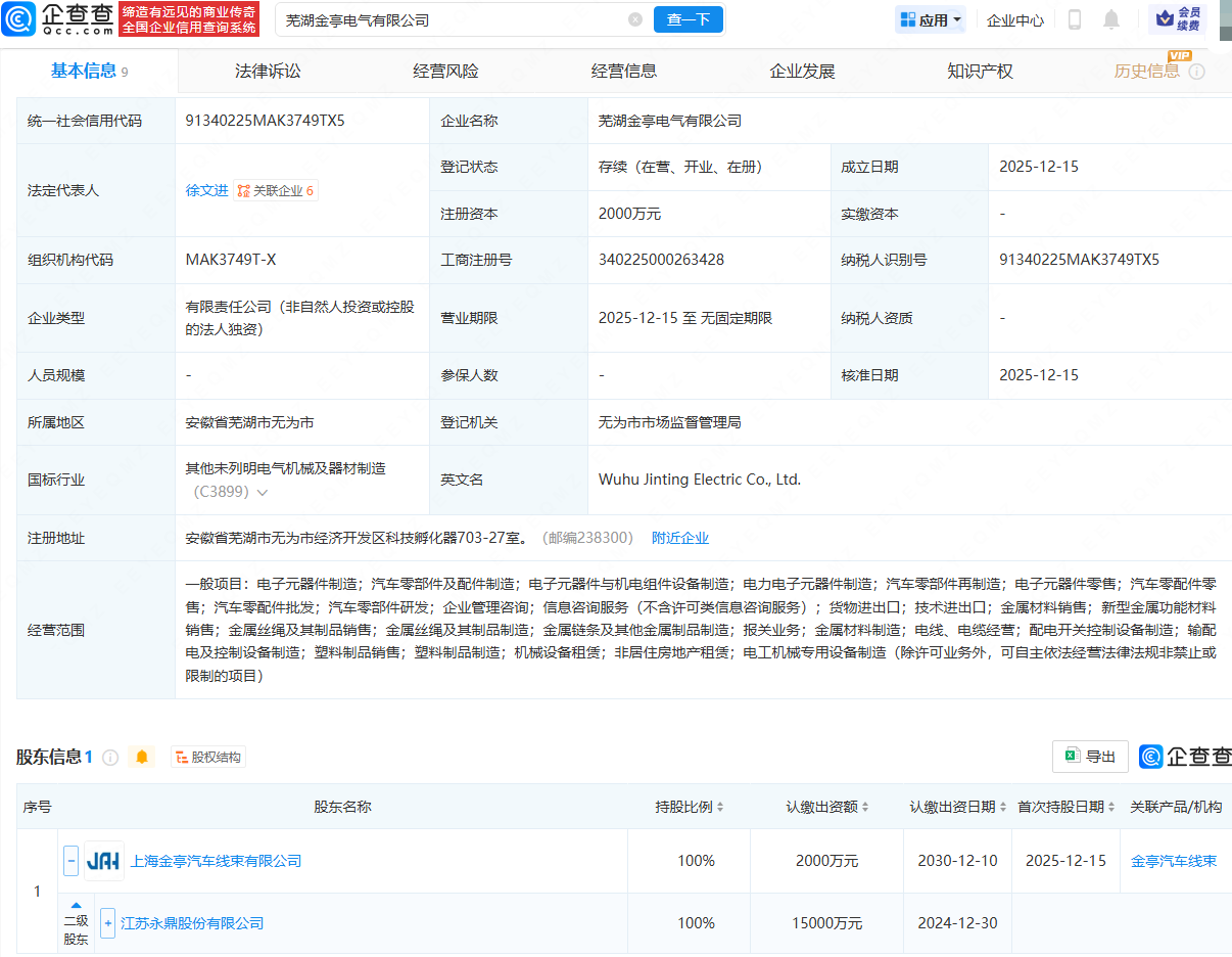 企查查APP显示,近日,芜湖金亭电气有限公司成立,法定代表人为徐文进,注册资本为2000万元,经营范围包含:电子元器件制造;汽车零部件及配件制造;电子元器件与机电组件设备制造;电力电子元器件制造等。企查查股权穿透显示,该公司由永鼎股份(600105)间接全资持股。