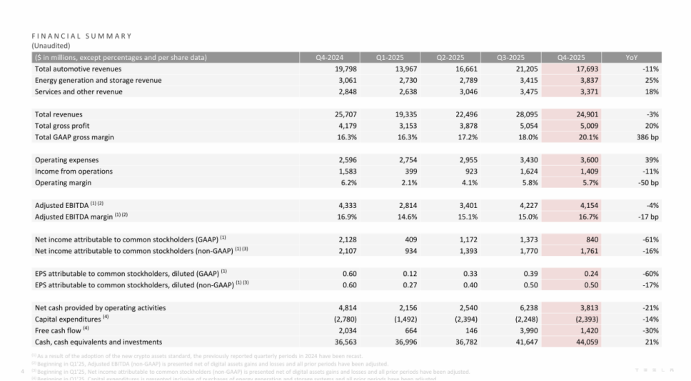 财报显示,特斯拉第四季度营收达249.01亿美元,同比下降约3%;其中汽车业务收入为176.93亿美元,同比下降约11%。归属于特斯拉普通股股东的净利润为8.4亿美元,同比下降约61%;非GAAP净利润为17.61亿美元,同比下降约16%。