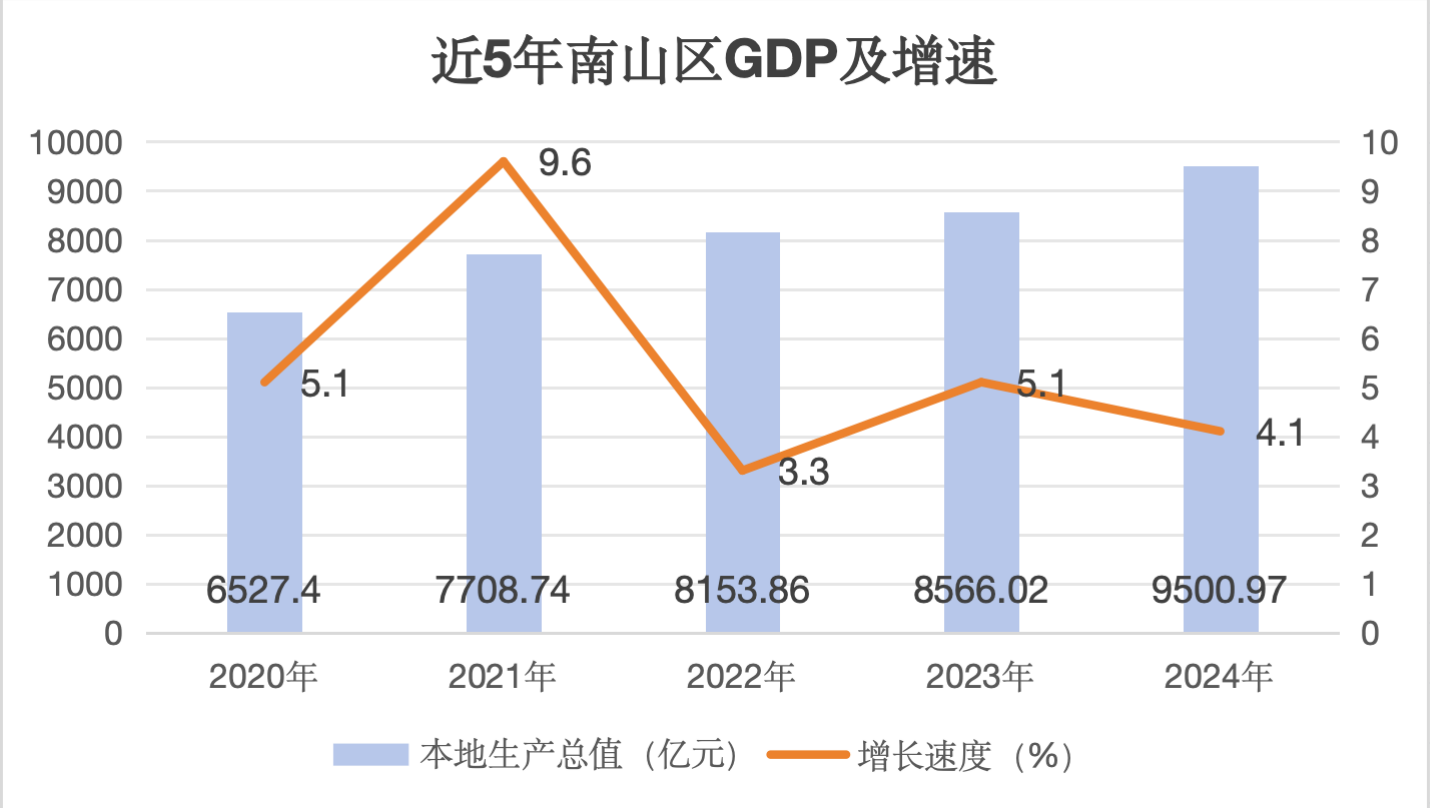 南山的体量变化尤其引人注目。2020年,南山区GDP尚为6527亿元;此后五年,连跨四个千亿级台阶,年均增速保持在5.8%以上。2025年,南山区GDP首破万亿元,地均GDP达54亿元/平方公里,人均GDP超过54万元,两项指标均位居全国前列。