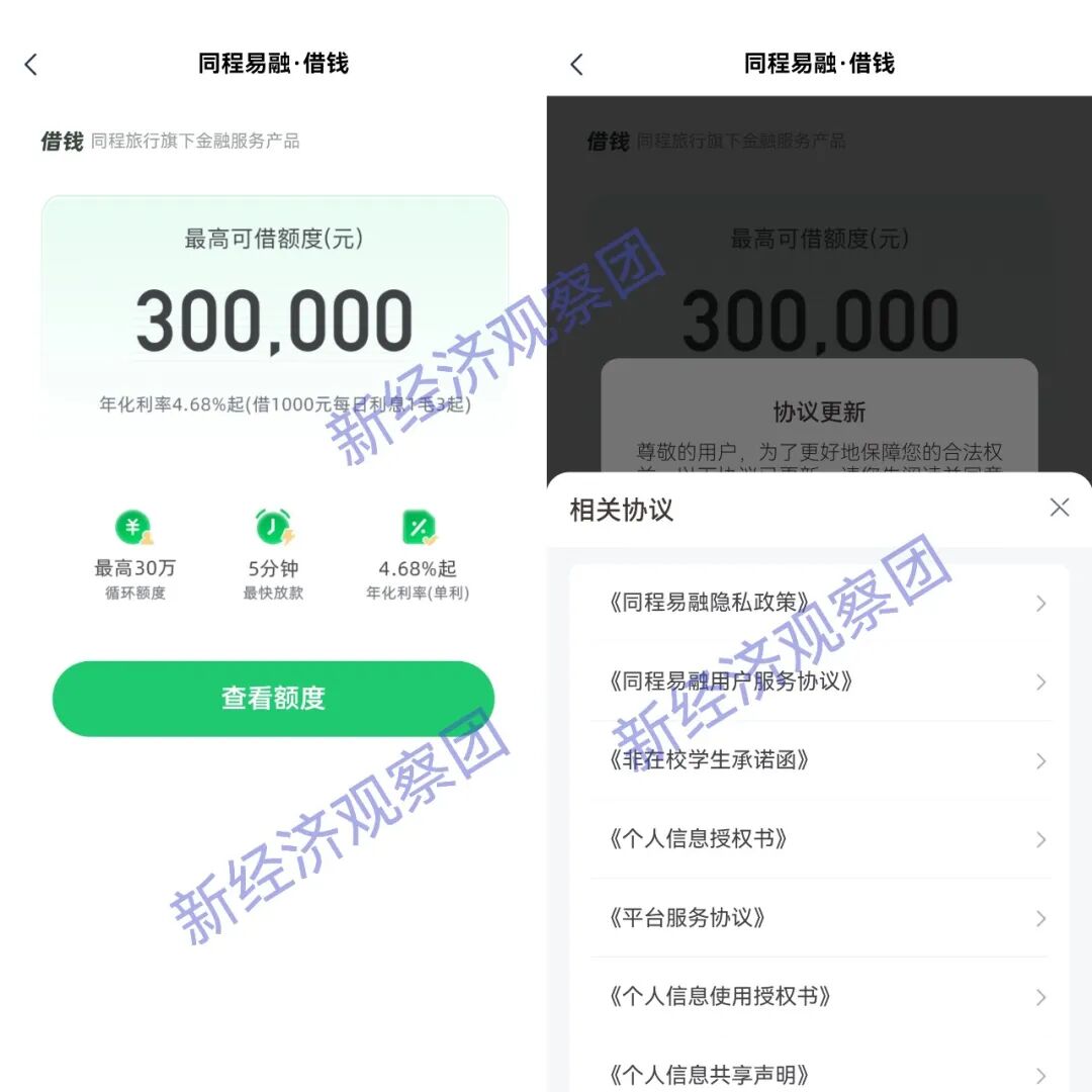 “信用贷”方面,据新经济观察团此前的报道,而在相关协议中,携程金融嵌入了41家“合作金融机构”,包括:上海尚诚消费金融有限公司、南京银行、渤海银行、华瑞银行、韩亚银行、江苏银行、苏银凯基消费金融、金美信消金、北京中关村银行、宁波银行、锦程消金、新网银行、星展银行、南银法巴消金、中邮消金、阳光消金、招联金融、众邦银行、中信消金、天津携程融资担保、晋商消金、宁银消金、富民银行、深圳汇丰融资担保、河北幸福消金、百信银行、平安消金等。