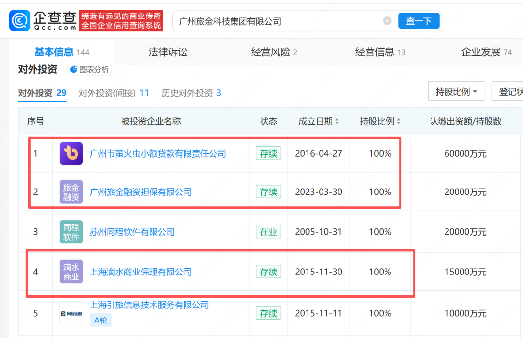 同程旅行的金融业务此前由同程数科提供。通过广州旅金科技集团有限公司,同程数科成立了广州市萤火虫小额贷款有限责任公司、广州旅金融资担保有限公司、上海滴水商业保理有限公司荣葆(苏州)资产管理有限公司,均持股100%。此前还曾成立深圳市泽众保险代理有限公司等,但目前已经被注销。